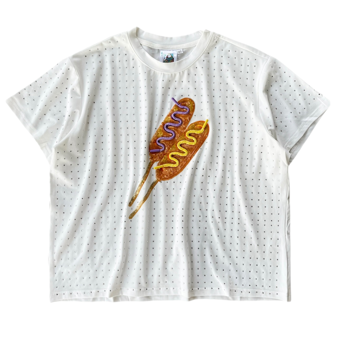 Jewel tee with corndog embellishment on front! Tees are a boxy fit!