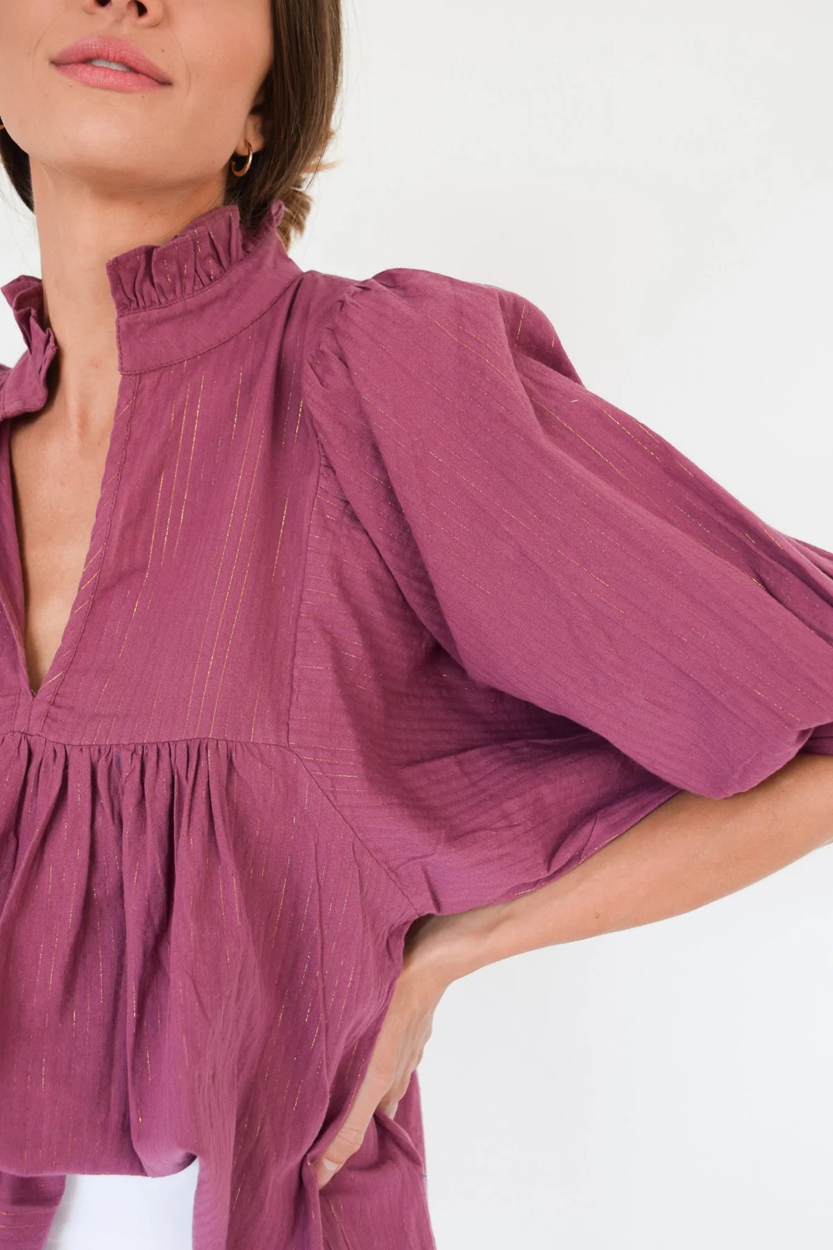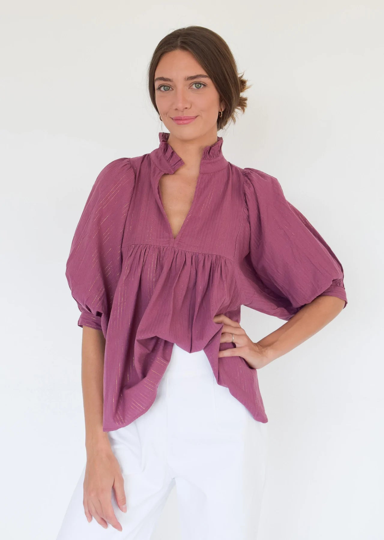 Our High Neck Top has a high neck ruffle, deep v-cut center, puff sleeves, and a roomy feel!