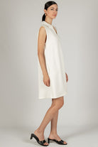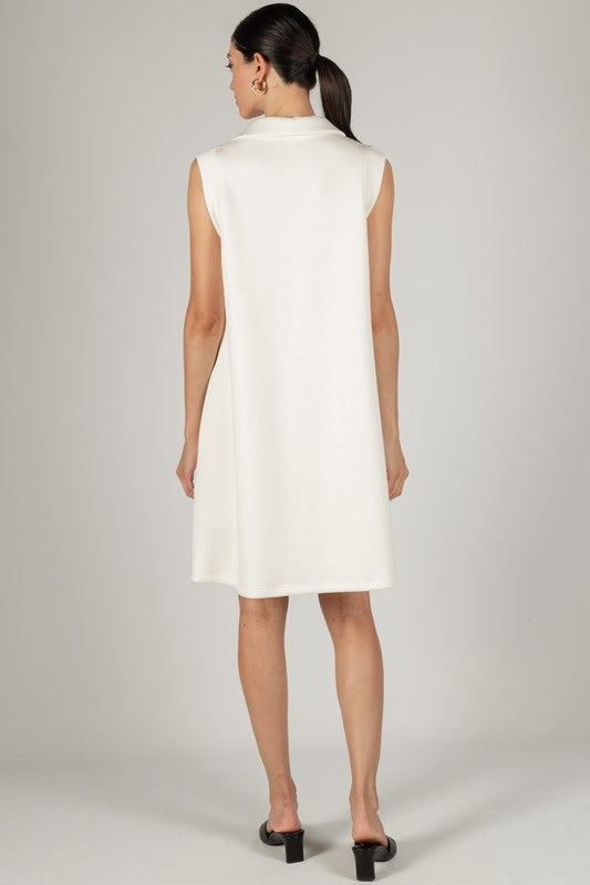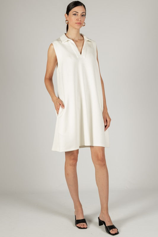 Scuba modal fabrication -Sleeveless -Collared v-neck -Mini length -Pockets