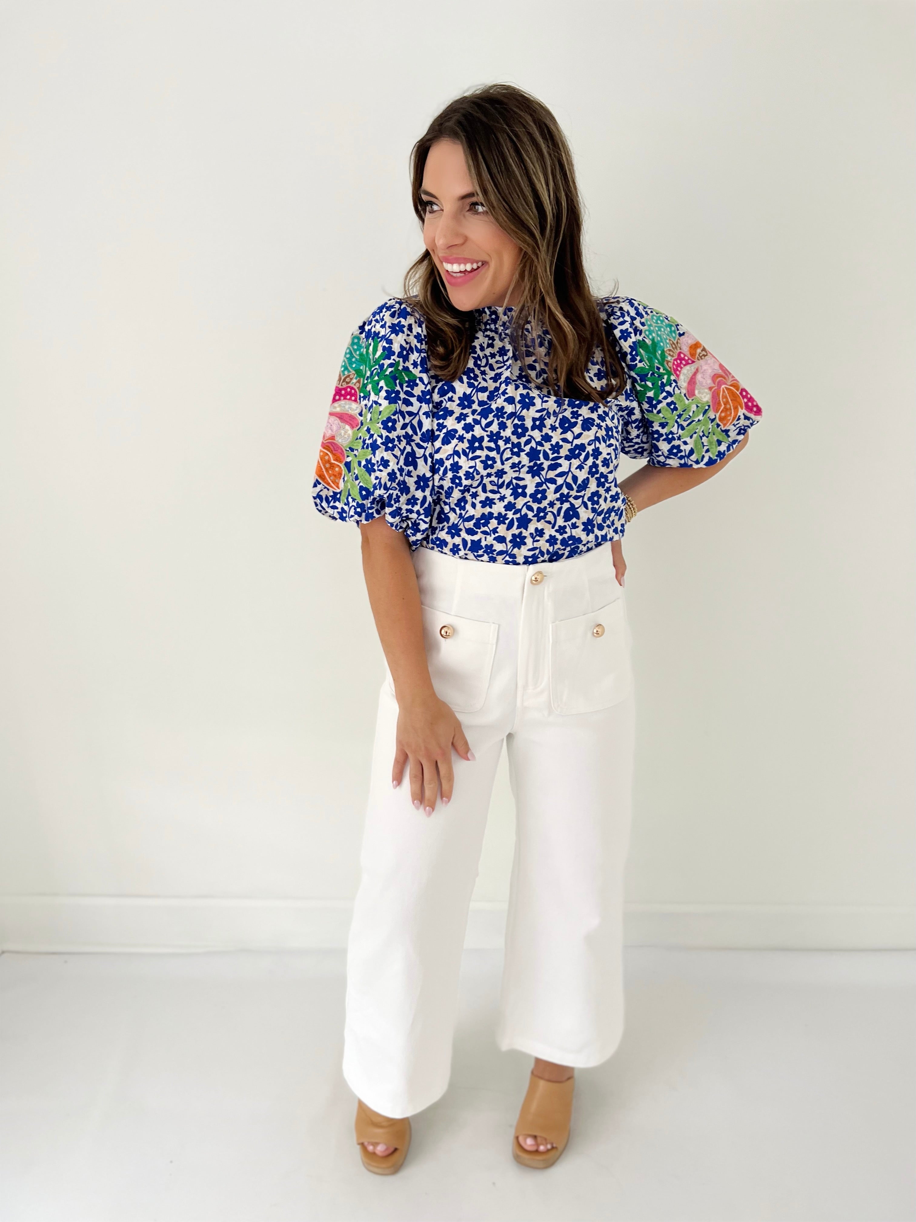 - Gold button closure with zip fly