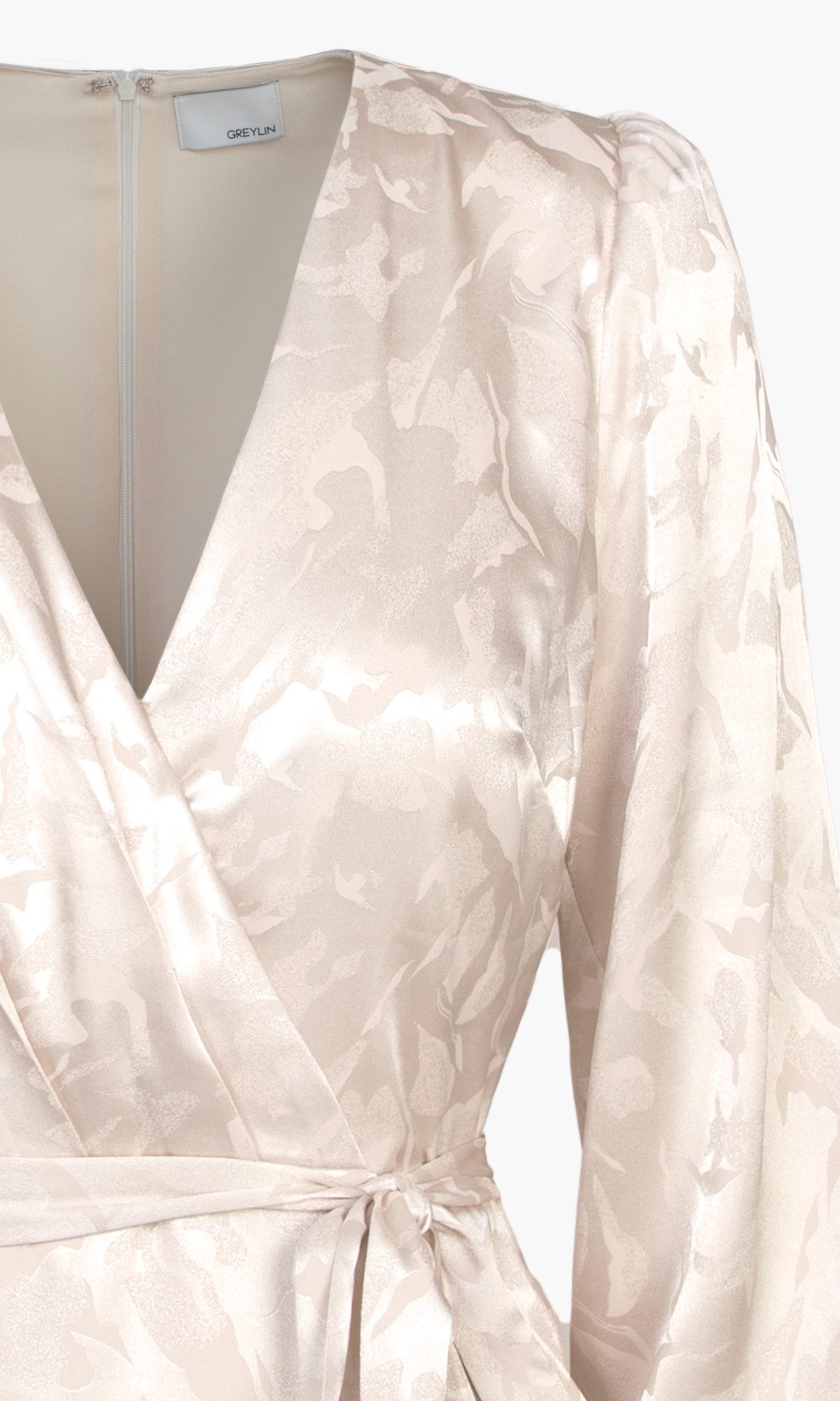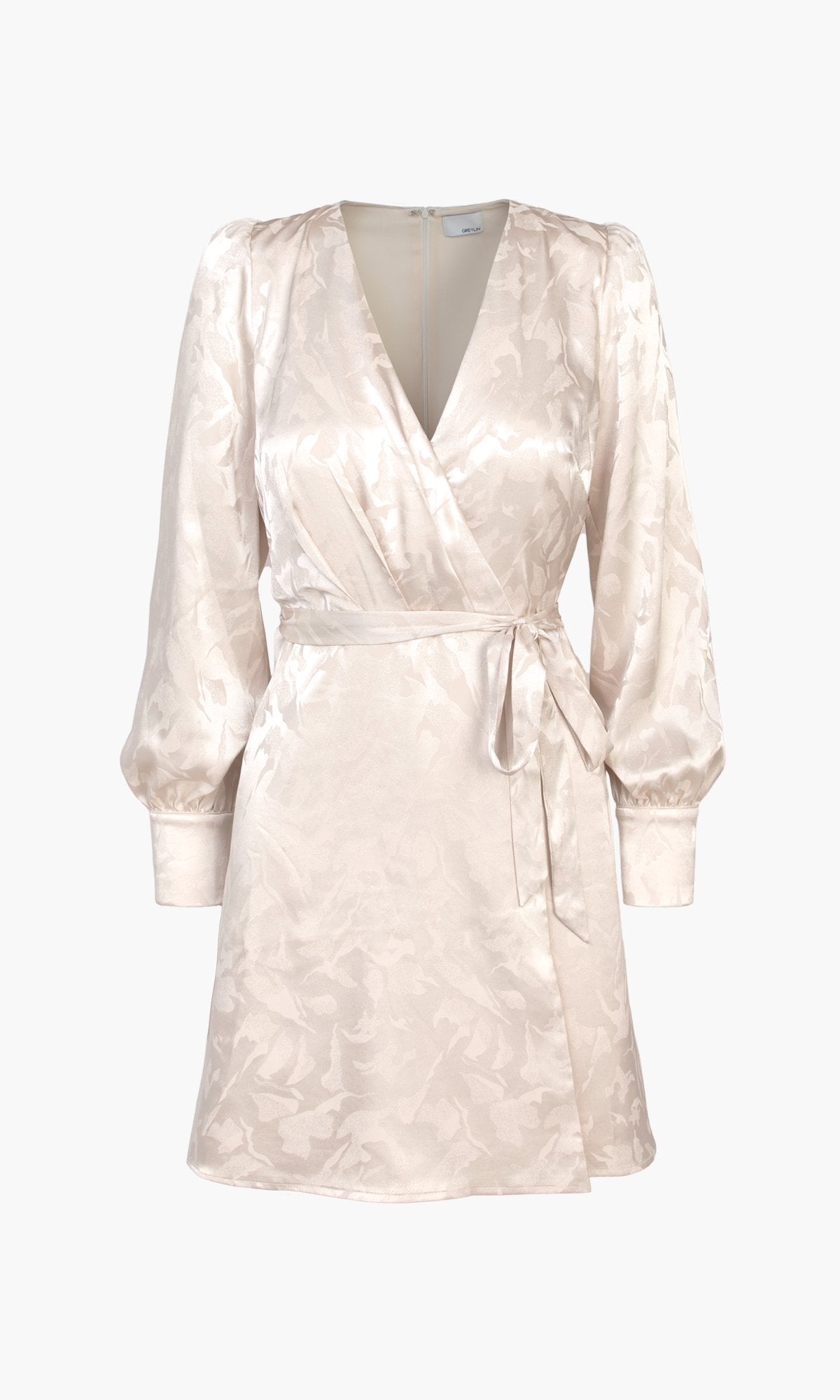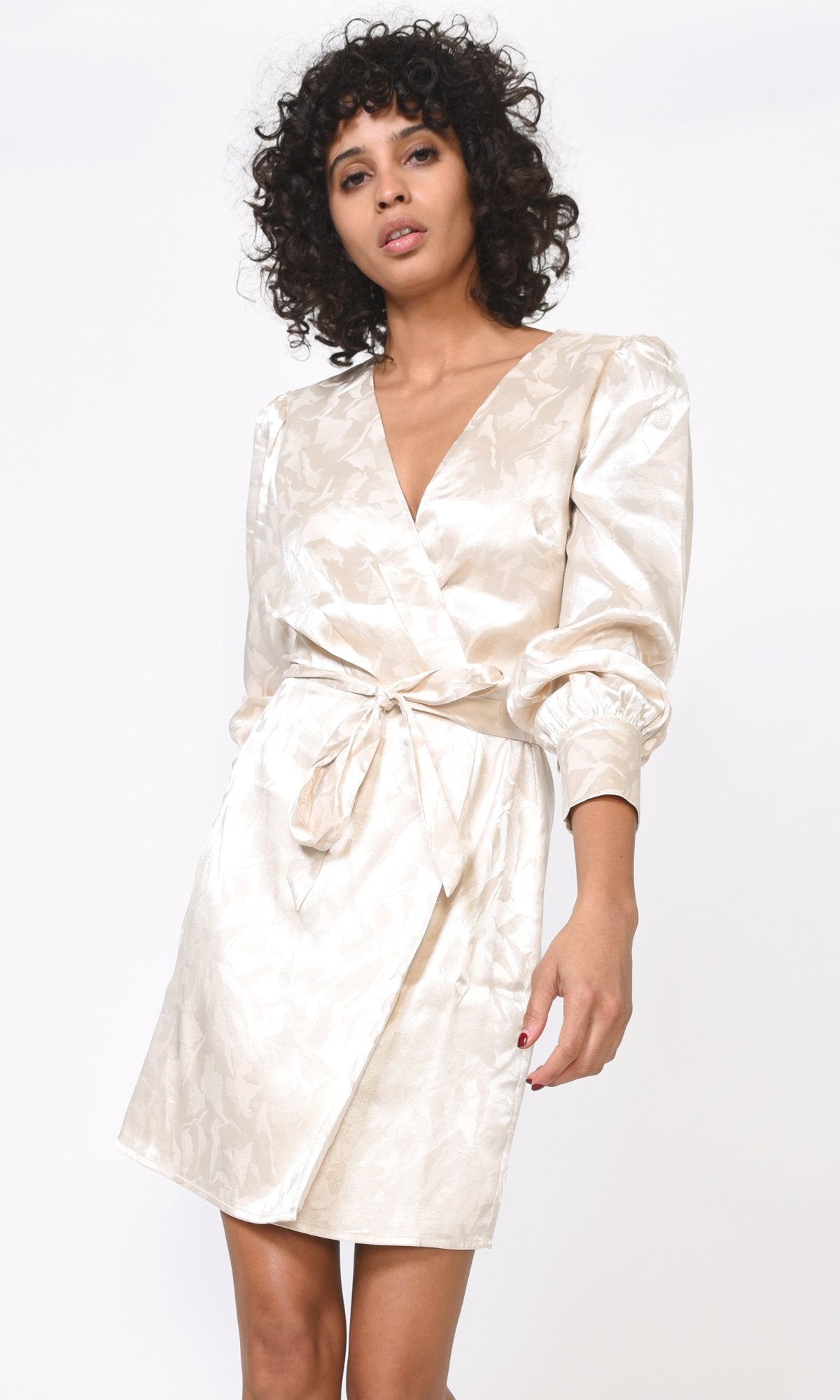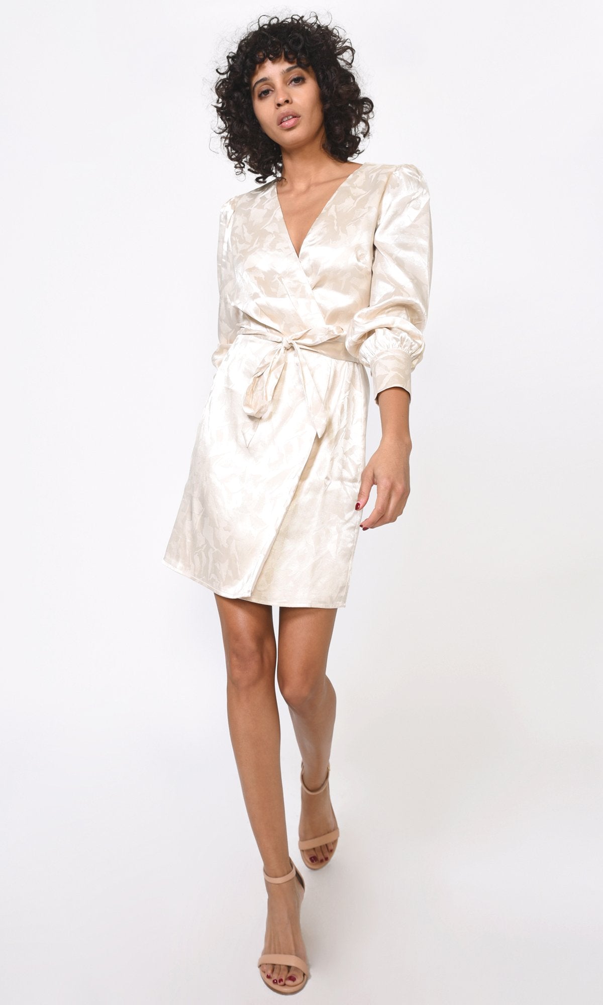 Get wrapped in the Pauline Jacquard Wrap Dress, a jacquard print dress that accentuates the waist in the best way. Its cuffed sleeves, faux wrap tie, pearl button details, and mini length makes this dress ideal for all the upcoming holidays.