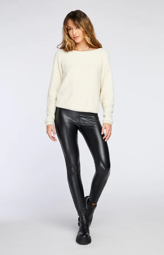 The Kate sweater is made of a plush yarn that is super soft. Features include a back twist detail and hidden snap closures at the shoulder to keep bra straps in place.