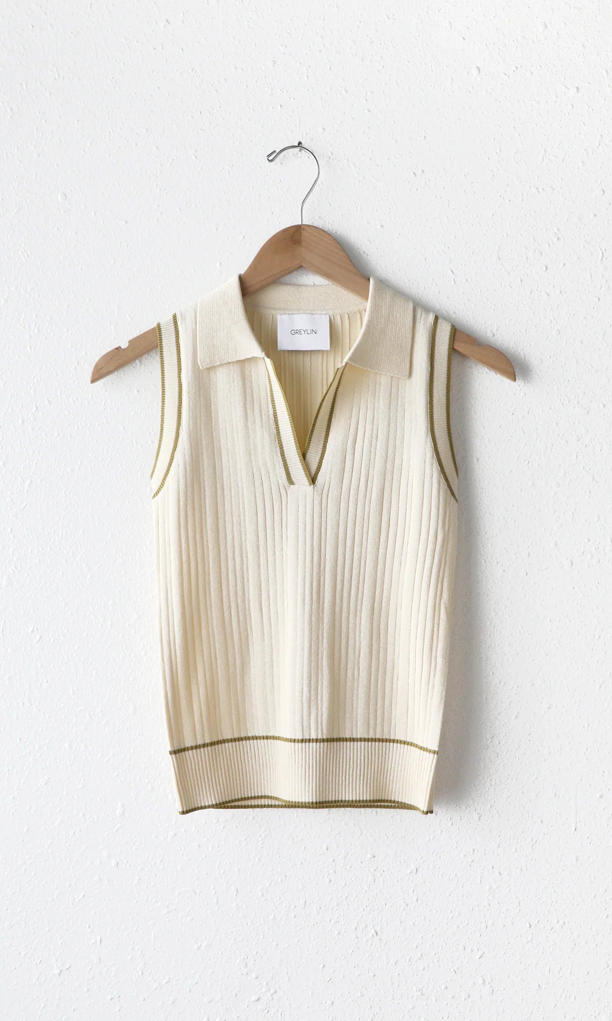 Knit top accented with green lines. The thin material allows a breathable fit and the ability to layer over or under other wardrobe pieces.