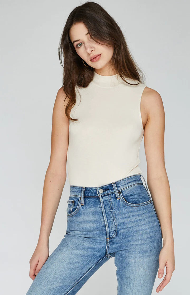 The Salma bodysuit is made of a stretchy ribbed fabric that hugs the body. Features include a mock neckline, adjustable snap closure, and a thong-cut bottom.