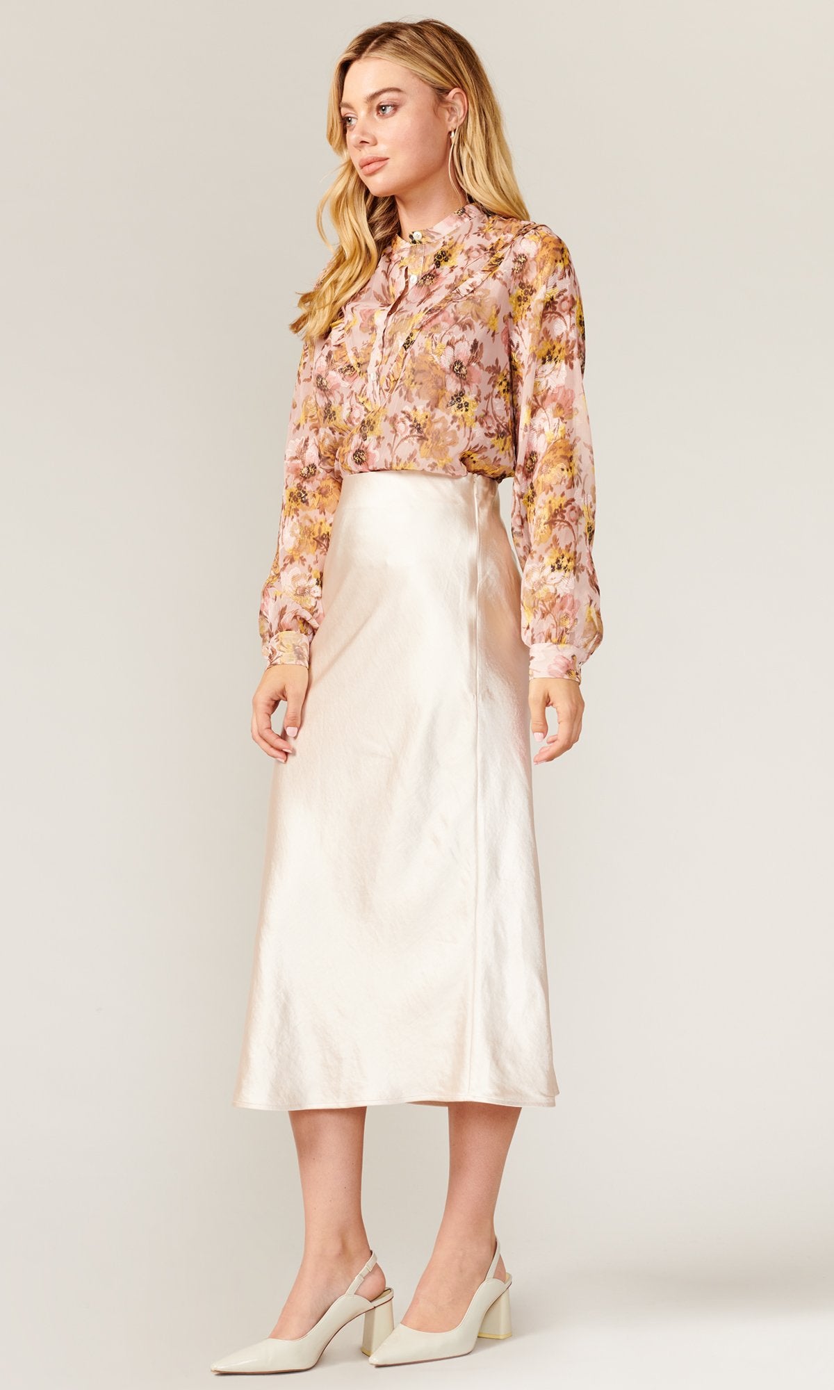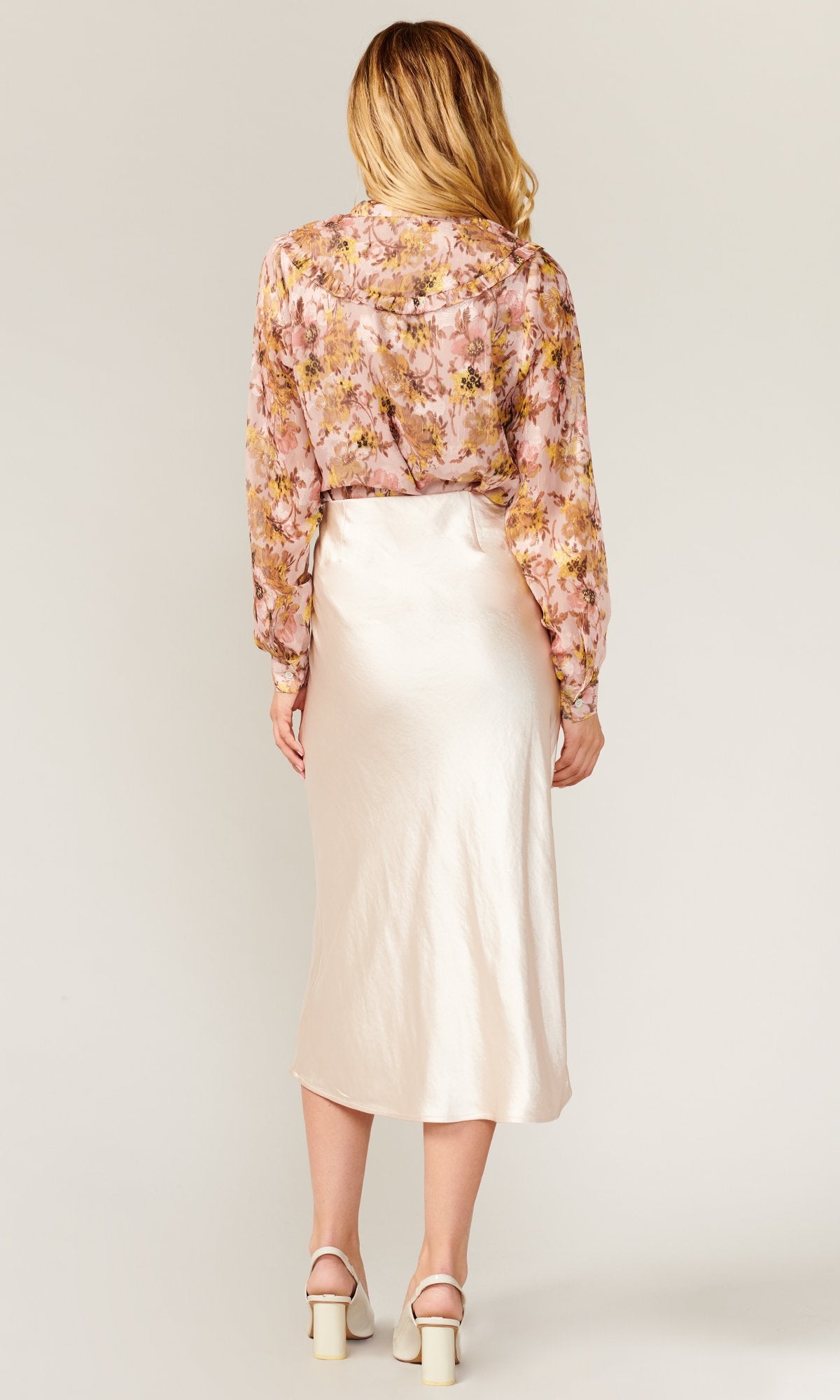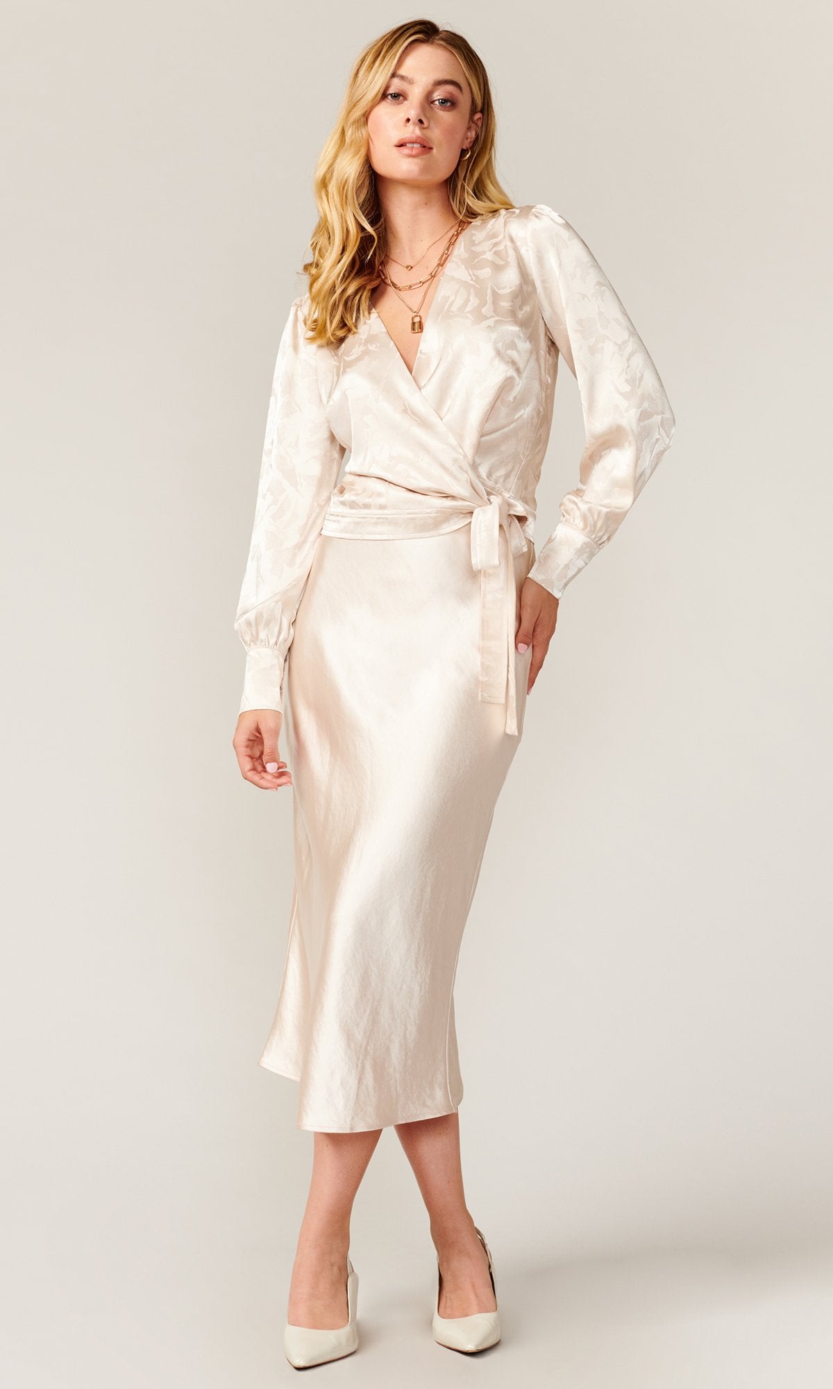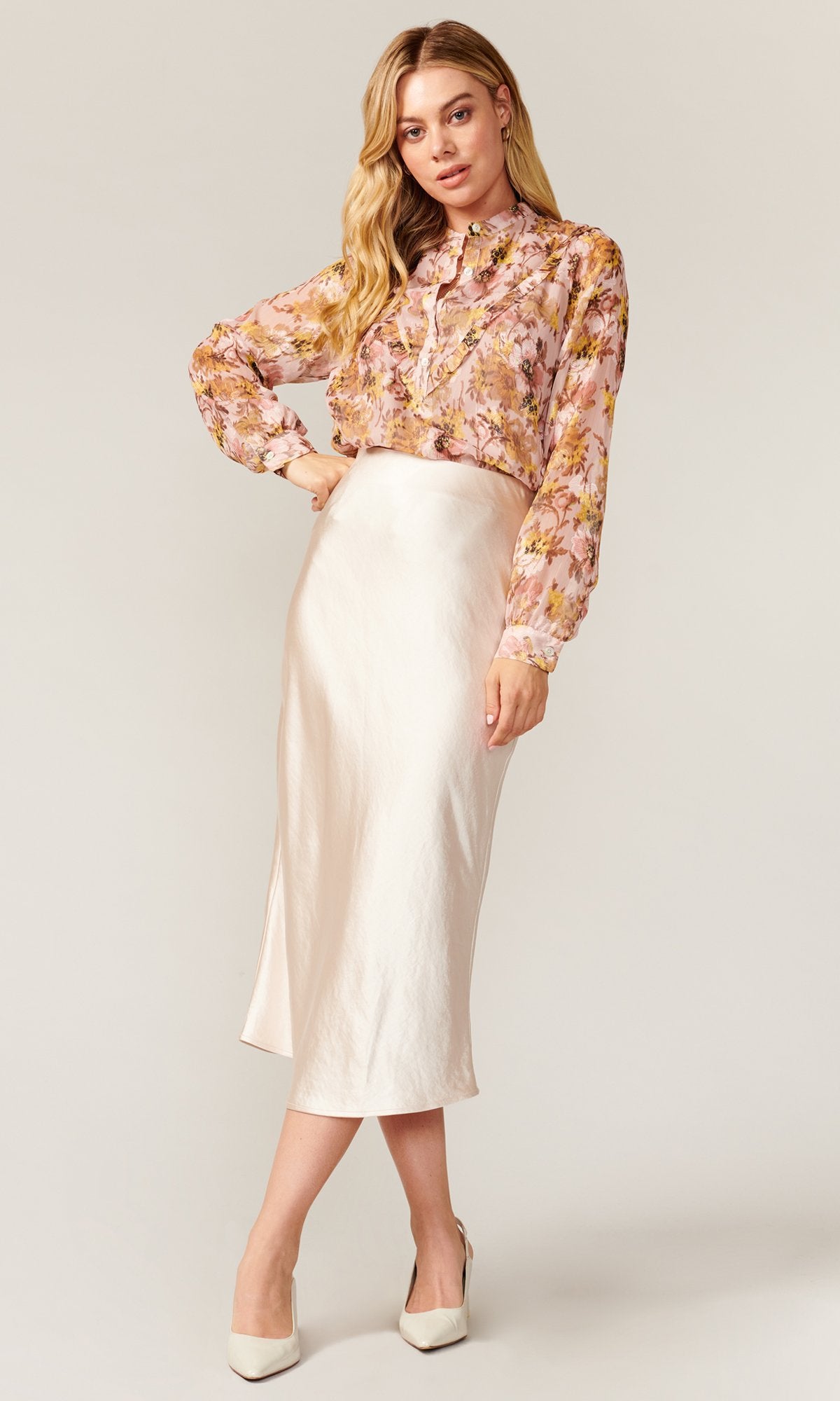 Dance the night away in our Athena Sateen Bias Cut Skirt. Made of shimmery sateen fabrication this midi skirt features a bias cut, elasticated waistline, and back dart details. Pair with a printed blouse or a chunky sweater for a holiday-ready look.