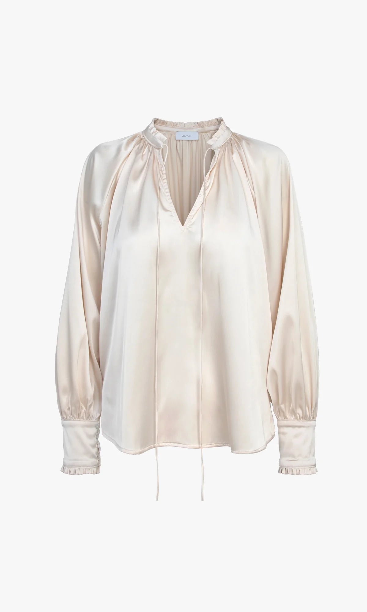 Satin poet sleeve blouse with wide buttoned cuffs has a small ruffle edge around neckline and sleeve cuffs, "V" neckline with a small tie, easy gathering around shoulders for effortless easy styling.