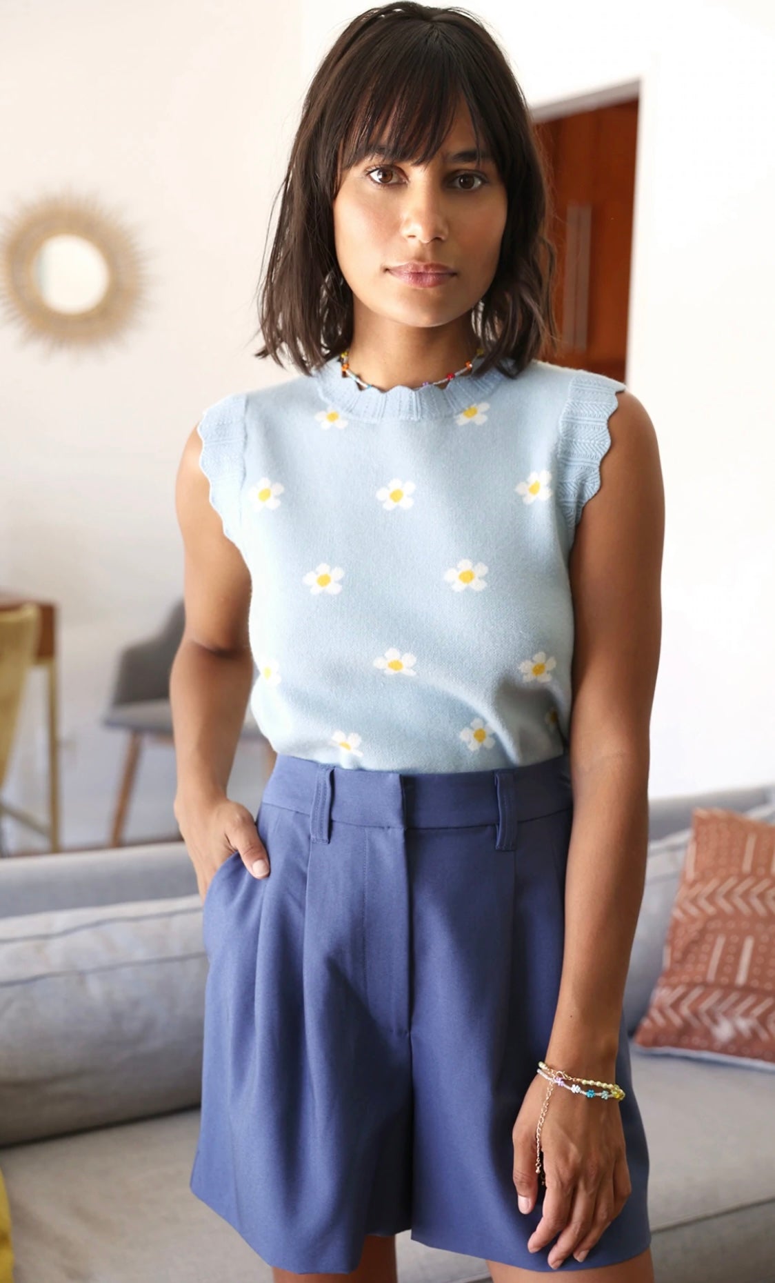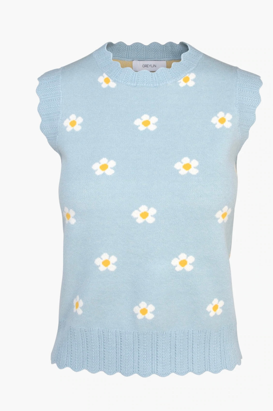 Sky Blue Daisy Scalloped Knit Shell Top