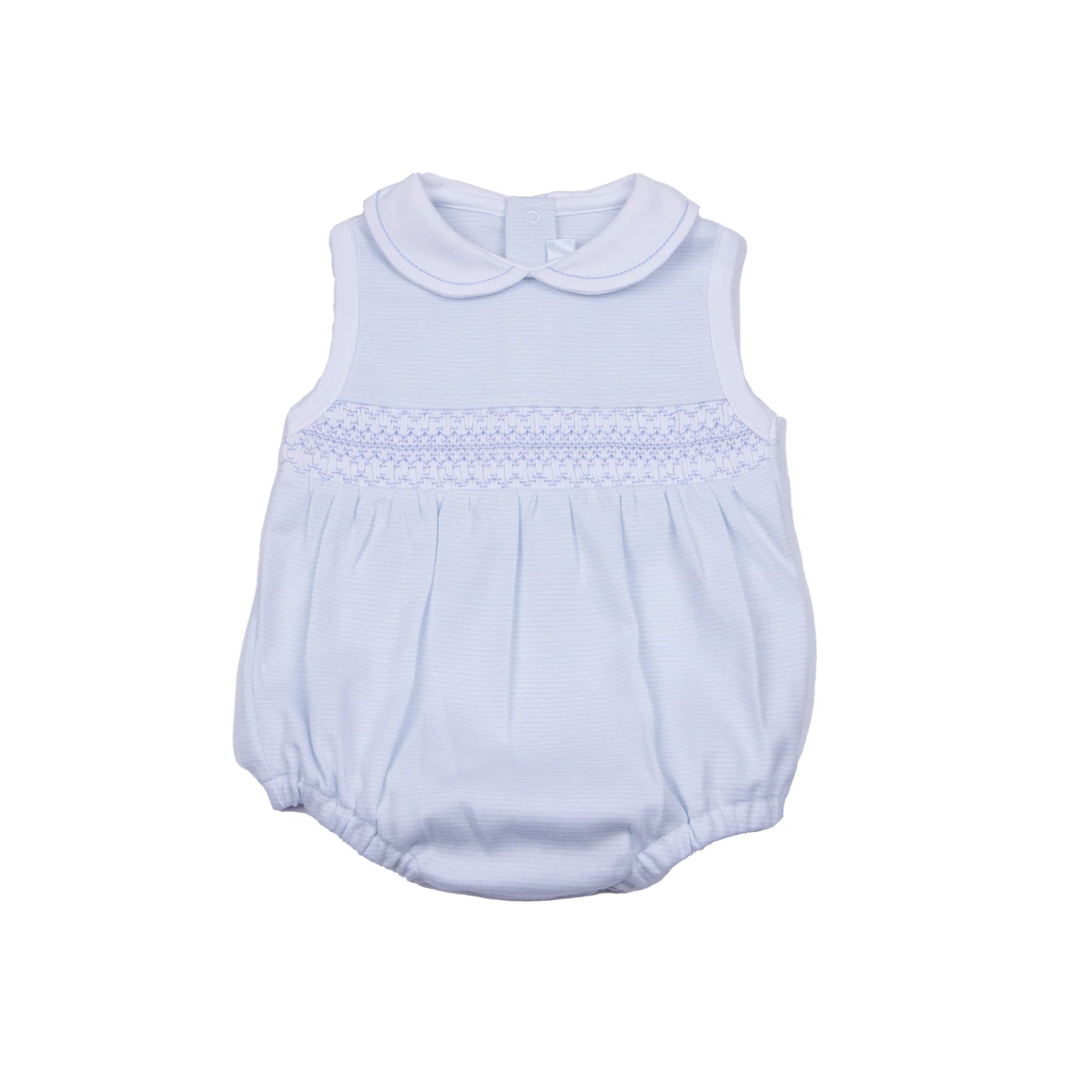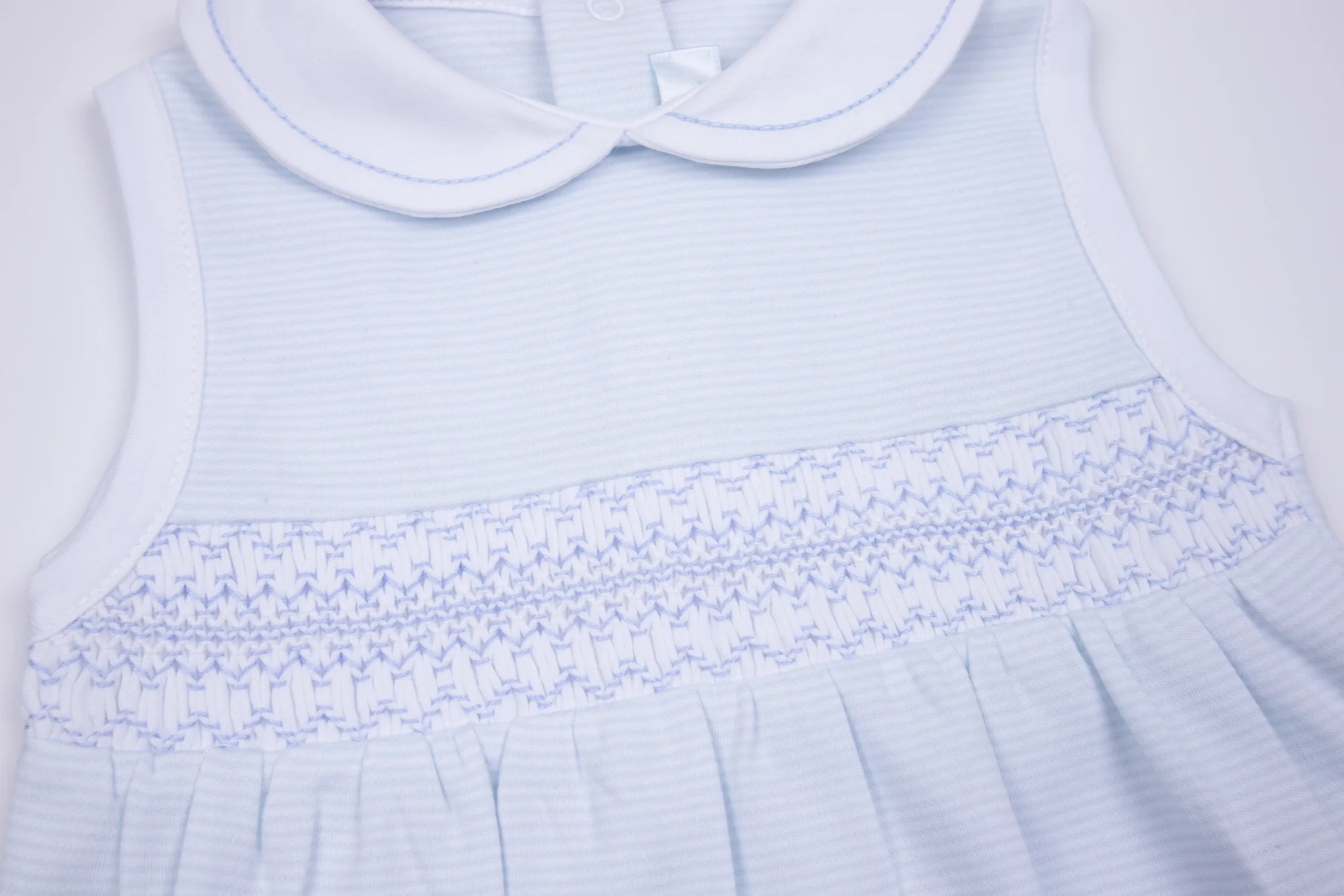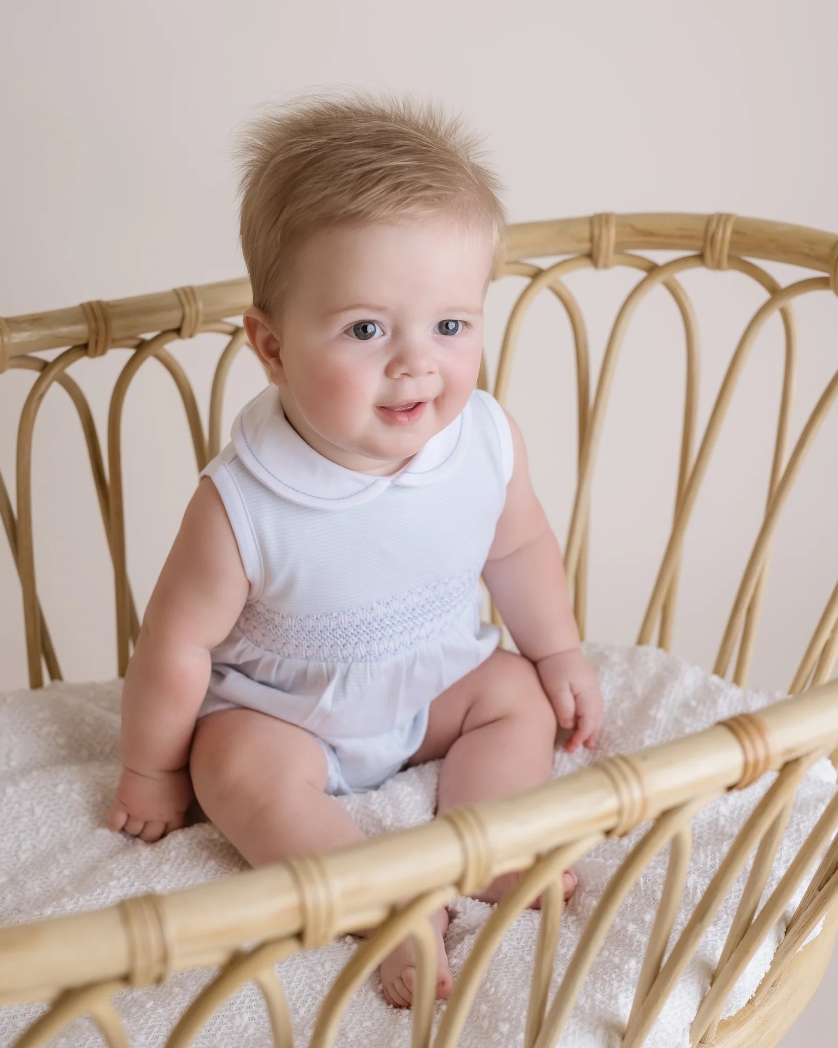 This soft, classic heirloom piece is carefully crafted with hand smocked details and luxurious Pima Cotton fabric. Perfect for any special occasion, this lightweight, light blue bubble romper is perfect for your little one, providing comfortable and stylish all-day wear. It has a snap closure at the neck and snap opening at the legs. We recommend washing on a gentle cycle and line dry to protect the quality of the outfit.