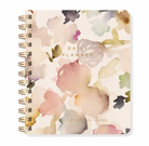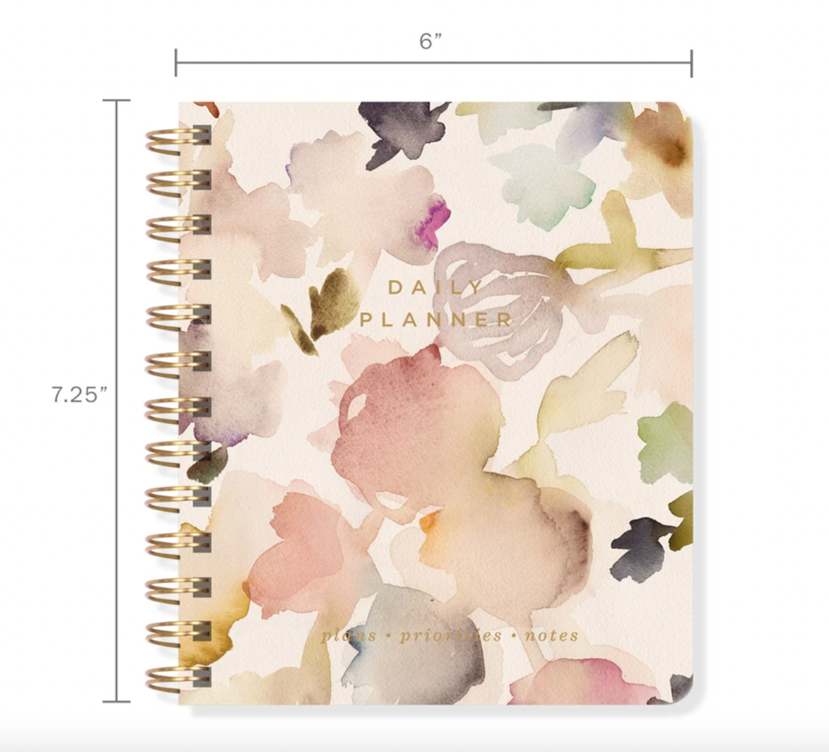 Paper cover with metallic gold stamping and exposed twin-ring spiral binding. Perpetual planner with daily prompted interior pages.
