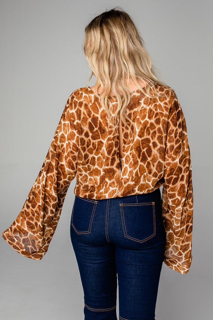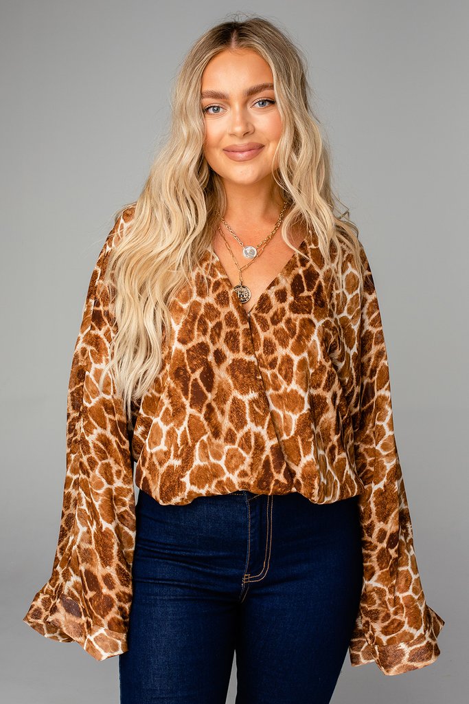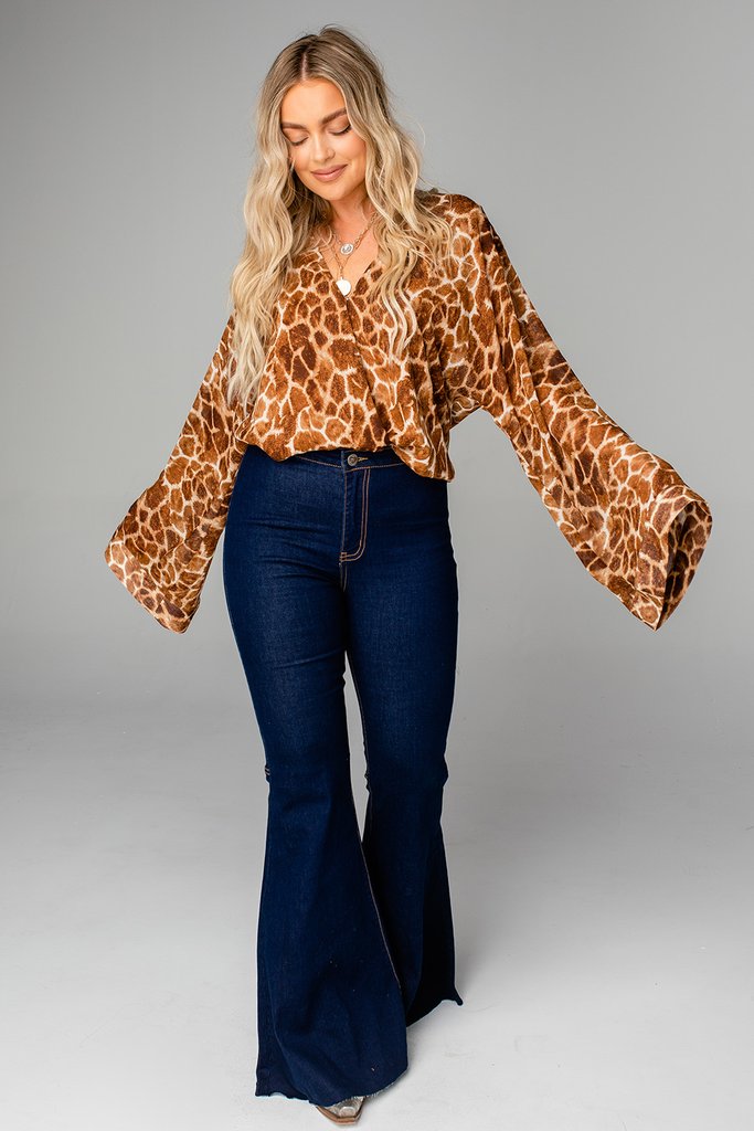 GO OFFFF this season in our new Ariana Bodysuit! She features a surplice neckline, button closure, long kimono sleeves and button closure on the bottom! She is paired perfectly with moonshine jeans a booties!