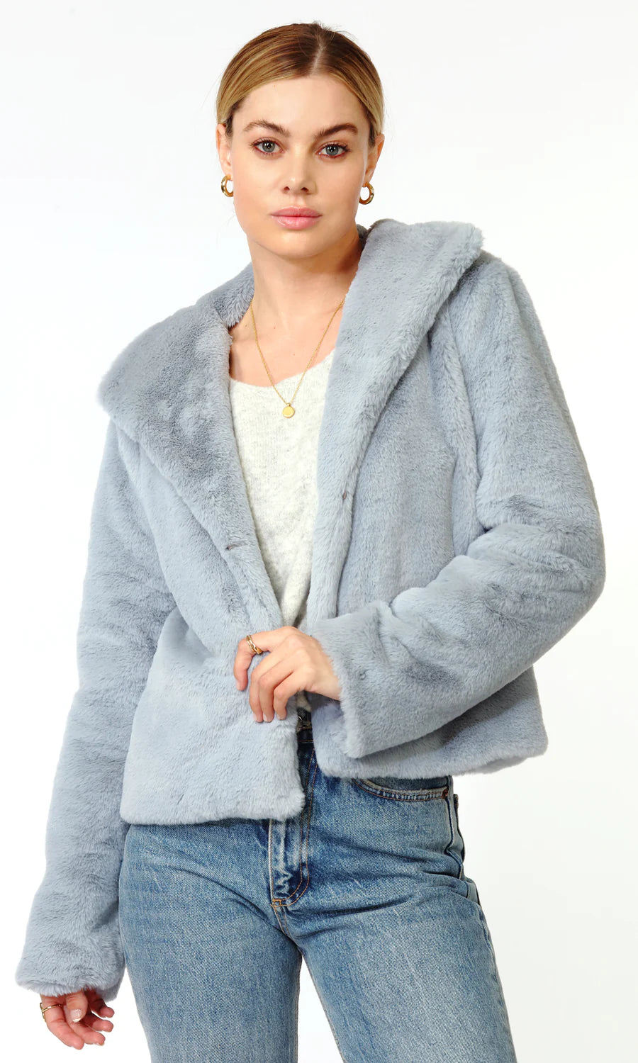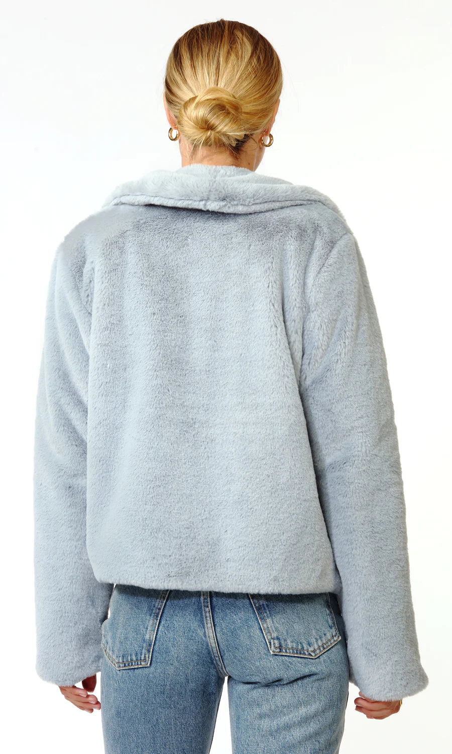 A fluffy collared jacket that's perfect for throwing over a matching outfit in the cold. It's lined with 100% polyester and closes with hidden hooks. Fits oversized so you can look and feel your coziest.