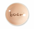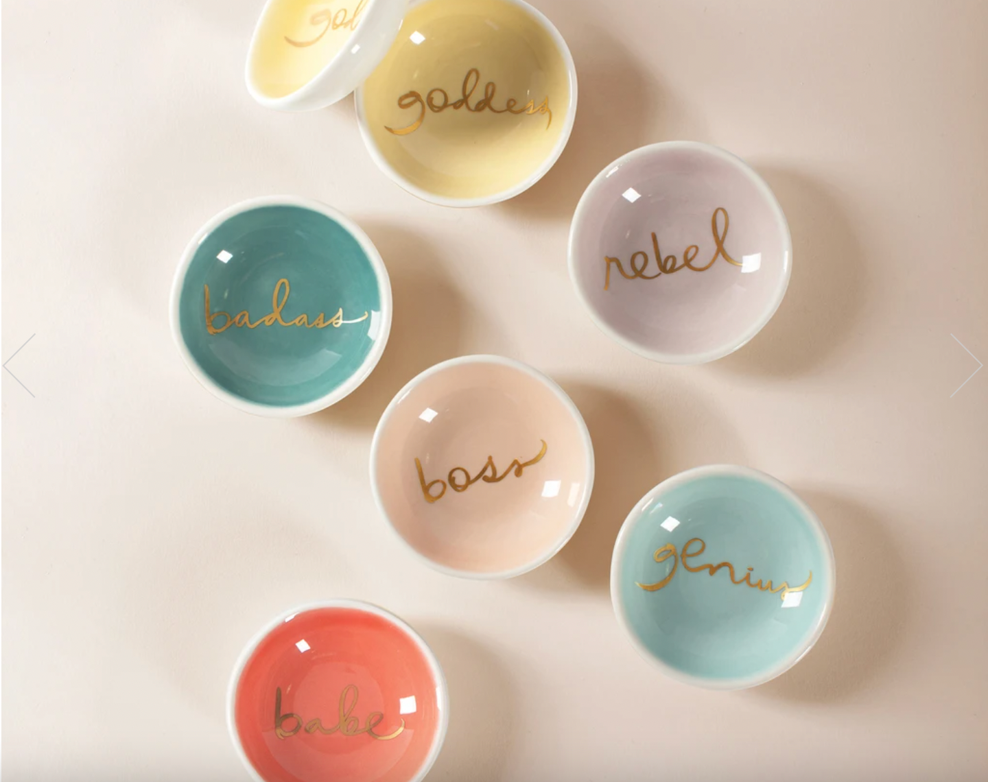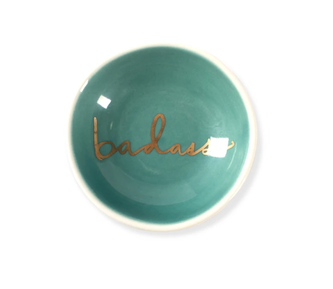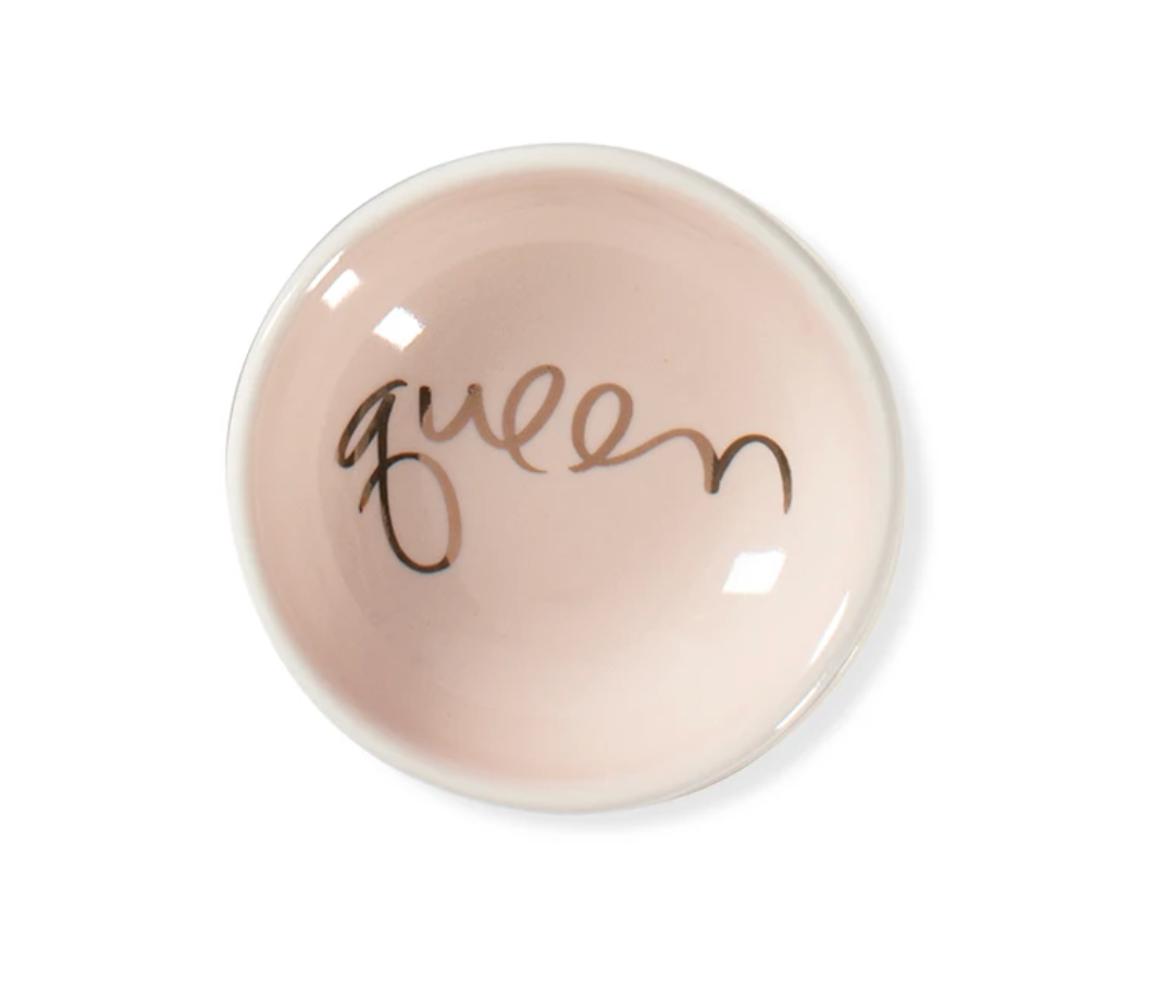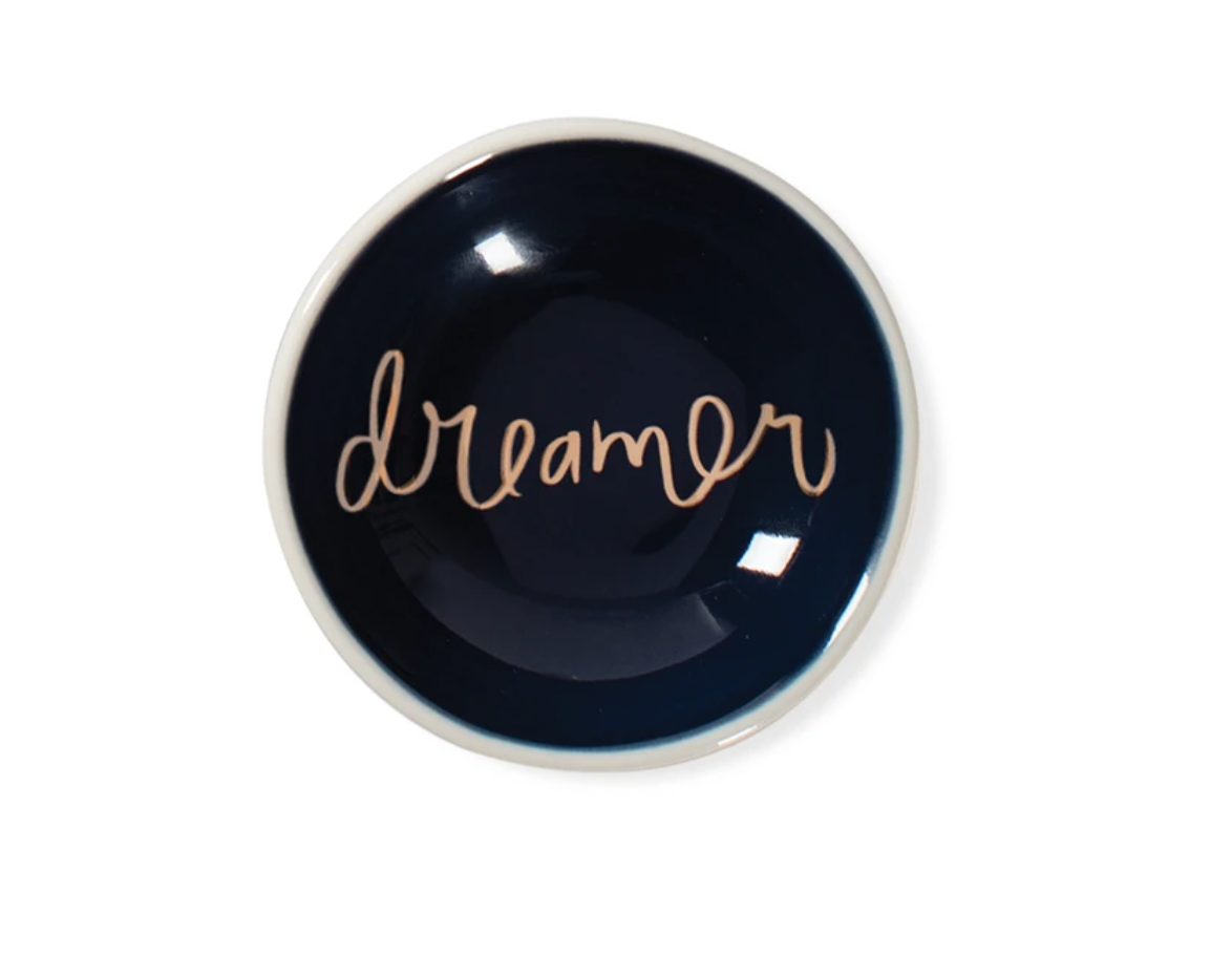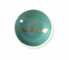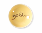 Stoneware round tray with semi-transparent glaze and metallic gold art.