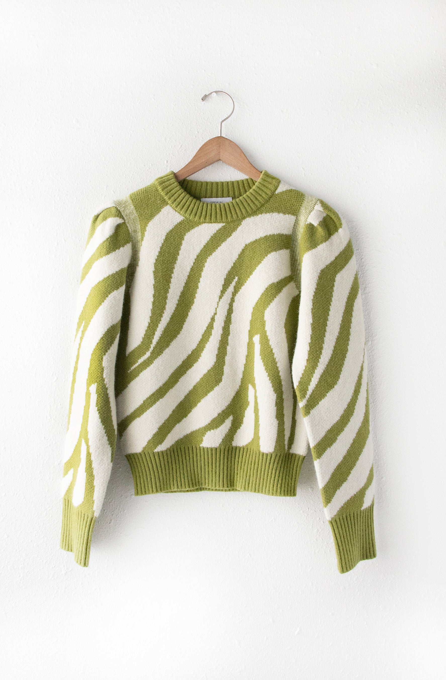 Take a walk on the wild side in the Harris Intarsia Knit Sweater. This cozy sweater knit features puff sleeves, two-toned intarsia in a fun pattern, and a crew neckline.