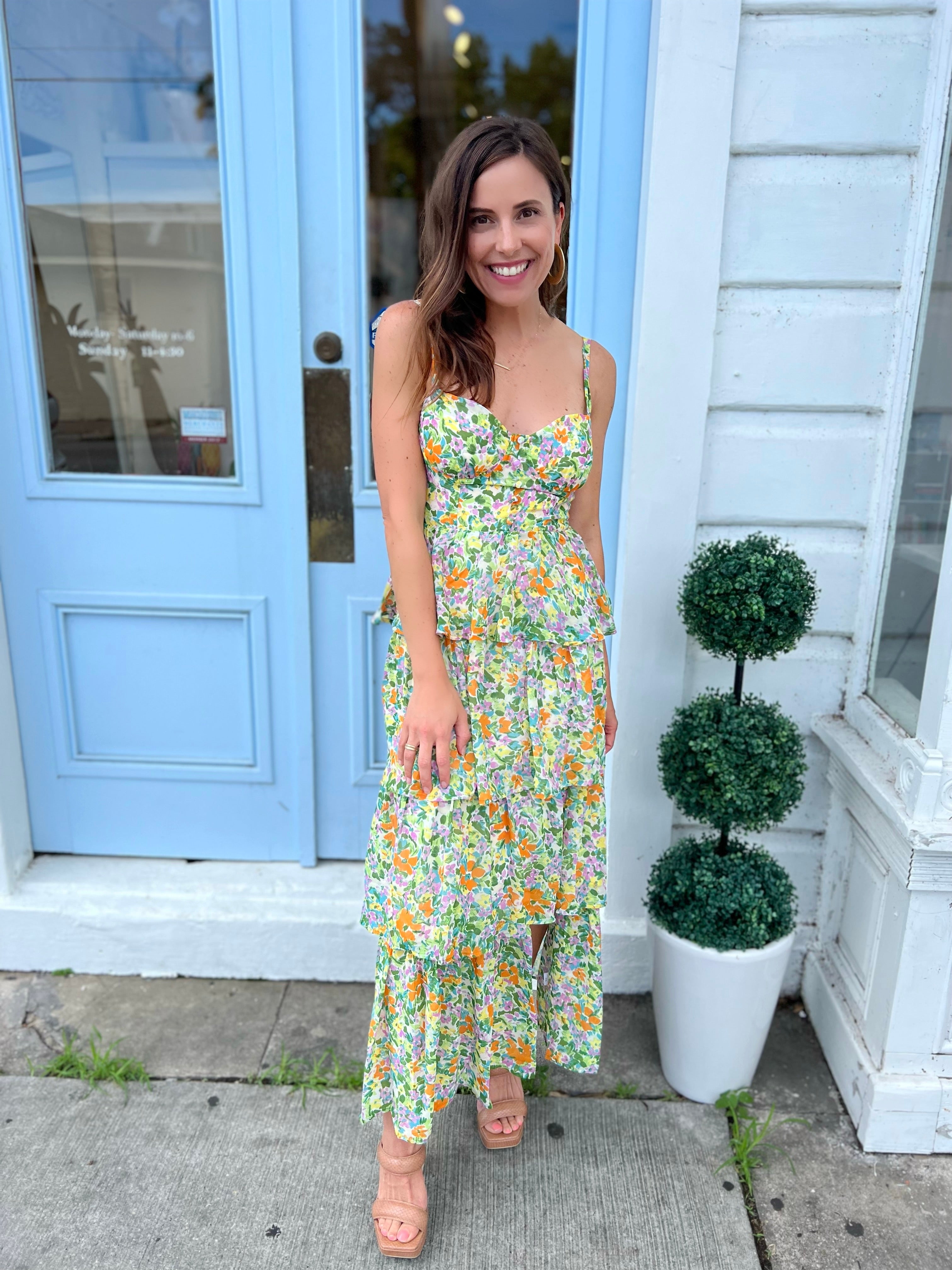 Green/Orange Floral Tiered Slit Midsummer Dress