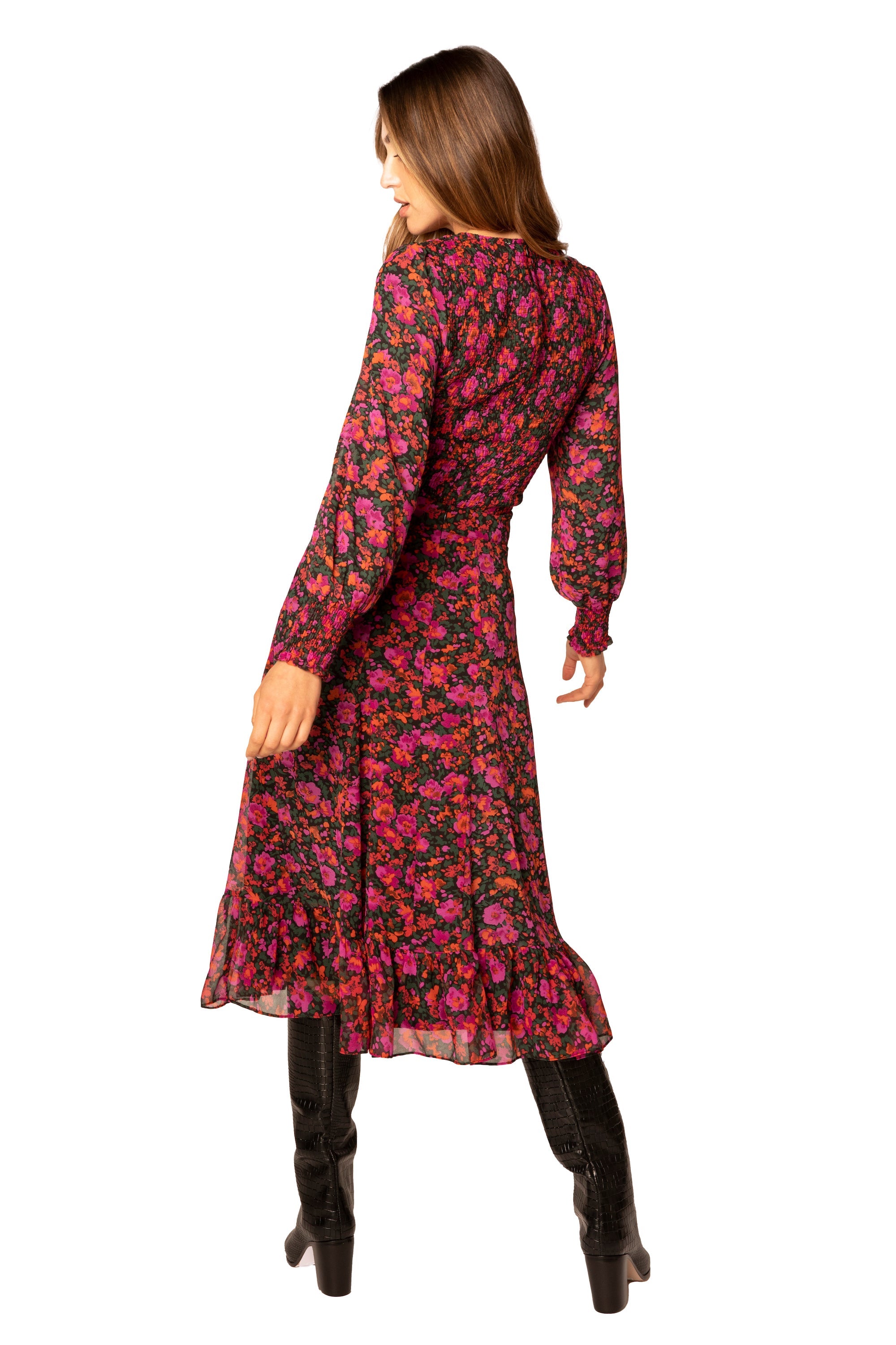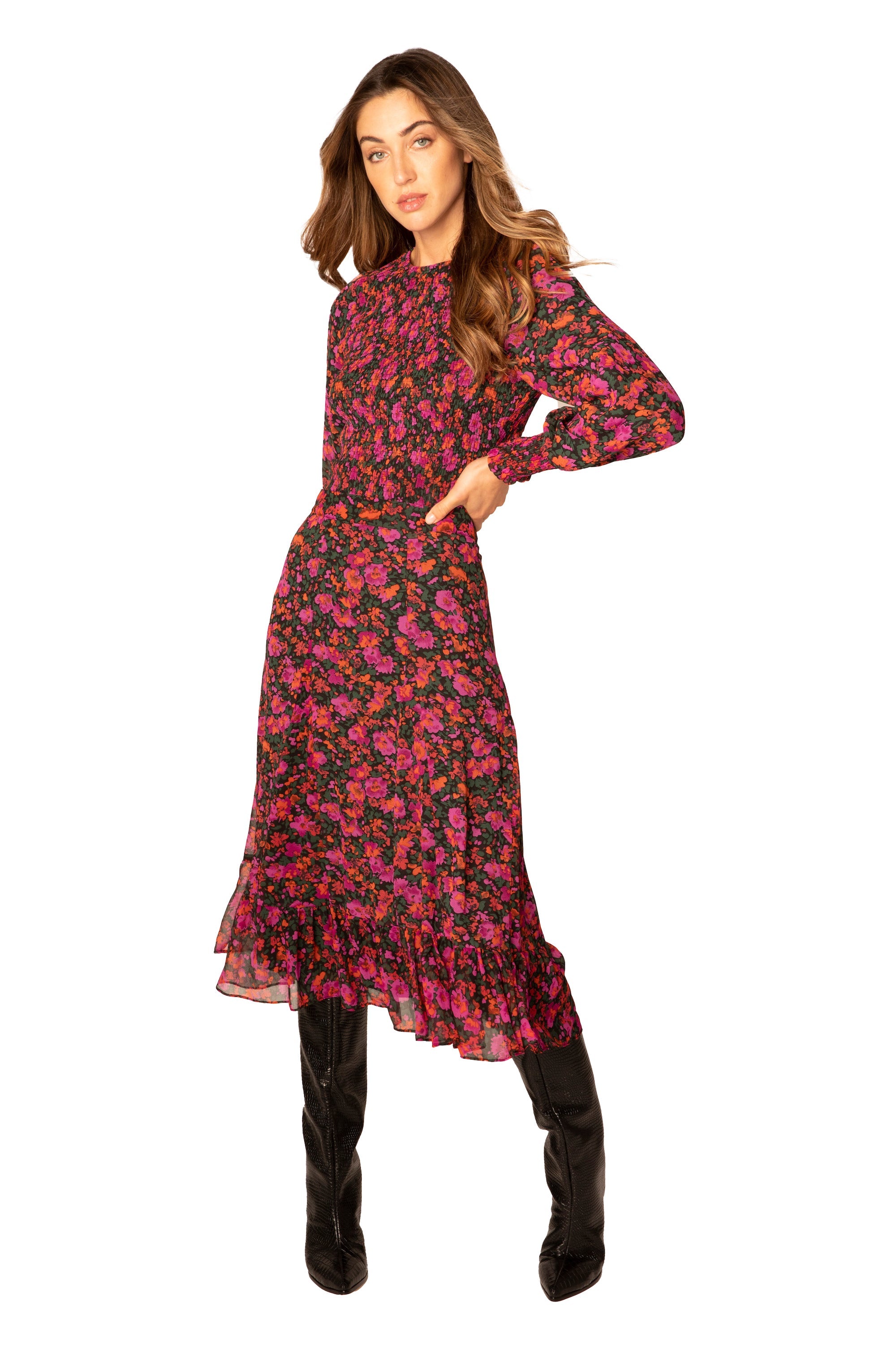 The smocked blouse was designed to be snug with stretchy smocking throughout the bodice. Cut in a high scoop neck and a back zipper closure. The semi-sheer long flowing sleeve is finished with a smocked cuff for an easy fit. Slightly cropped in length, this top pairs perfectly with the matching midi skirt or sassy little mini for a fabulous floral set.