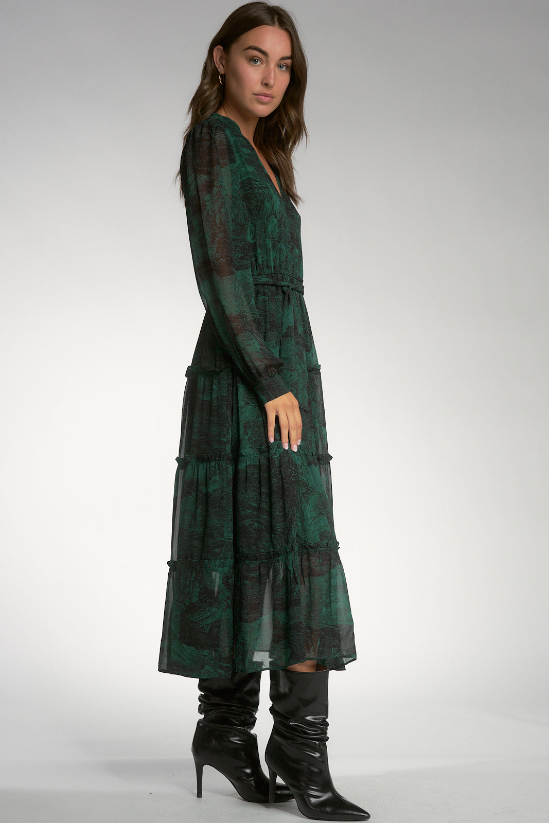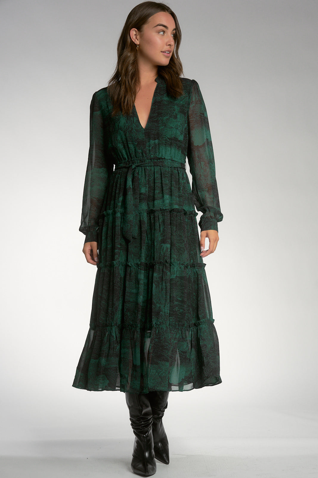 Beautifully designed in our classic chiffon material, this statement dress features a deep v-neckline, flattering waist, and tiered ruffles. Silhouette is flowy and relaxed.