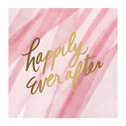 - Pink napkin with watercolor design and "happily ever after" in gold foil lettering