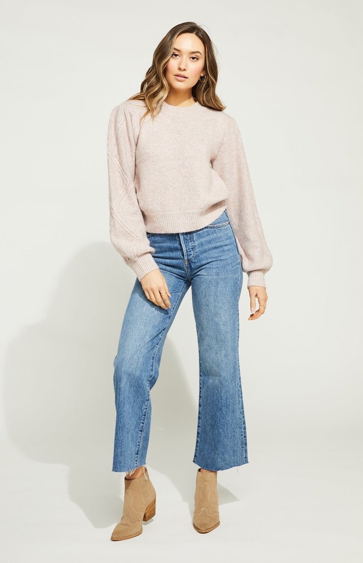 The Oleander sweater is made of a soft melange yarn and features a crew neckline and cable knit pattern along the sleeves. The feminine silhouette is perfect for everyday wear or dressed up for date night.