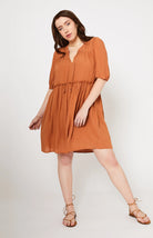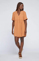 The Joplin dress is made of a soft textured dot fabric and lined for ease of wear. Features include a gathered waist detail, neck ties with metal beads, and a short sleeve with encased elastic at the hem.