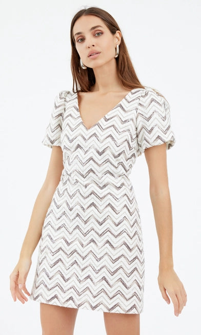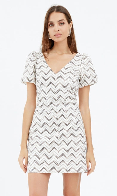 This Cali Sequins Chevron Mini Dress is the perfect combination of style and comfort. The sequin dress features a beautiful chevron stripe pattern with short sleeves and a v-neck. It's the ideal choice for a night out or any special occasion.