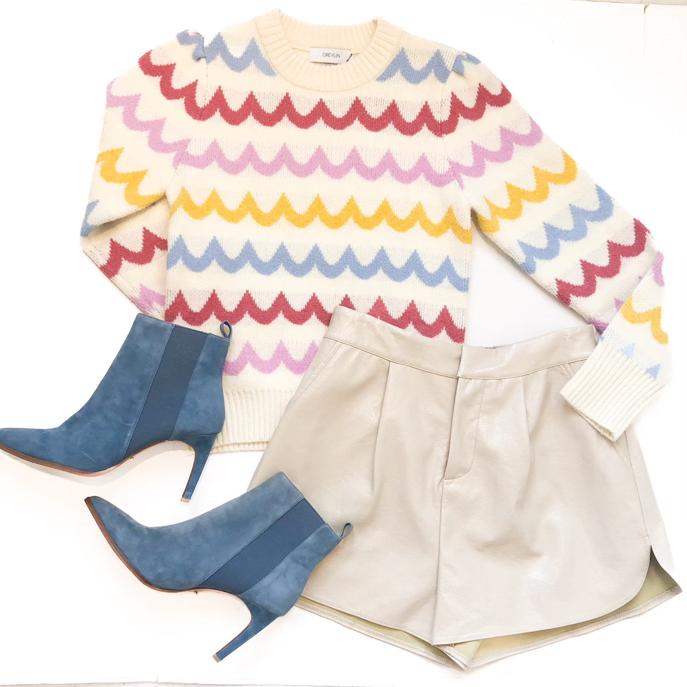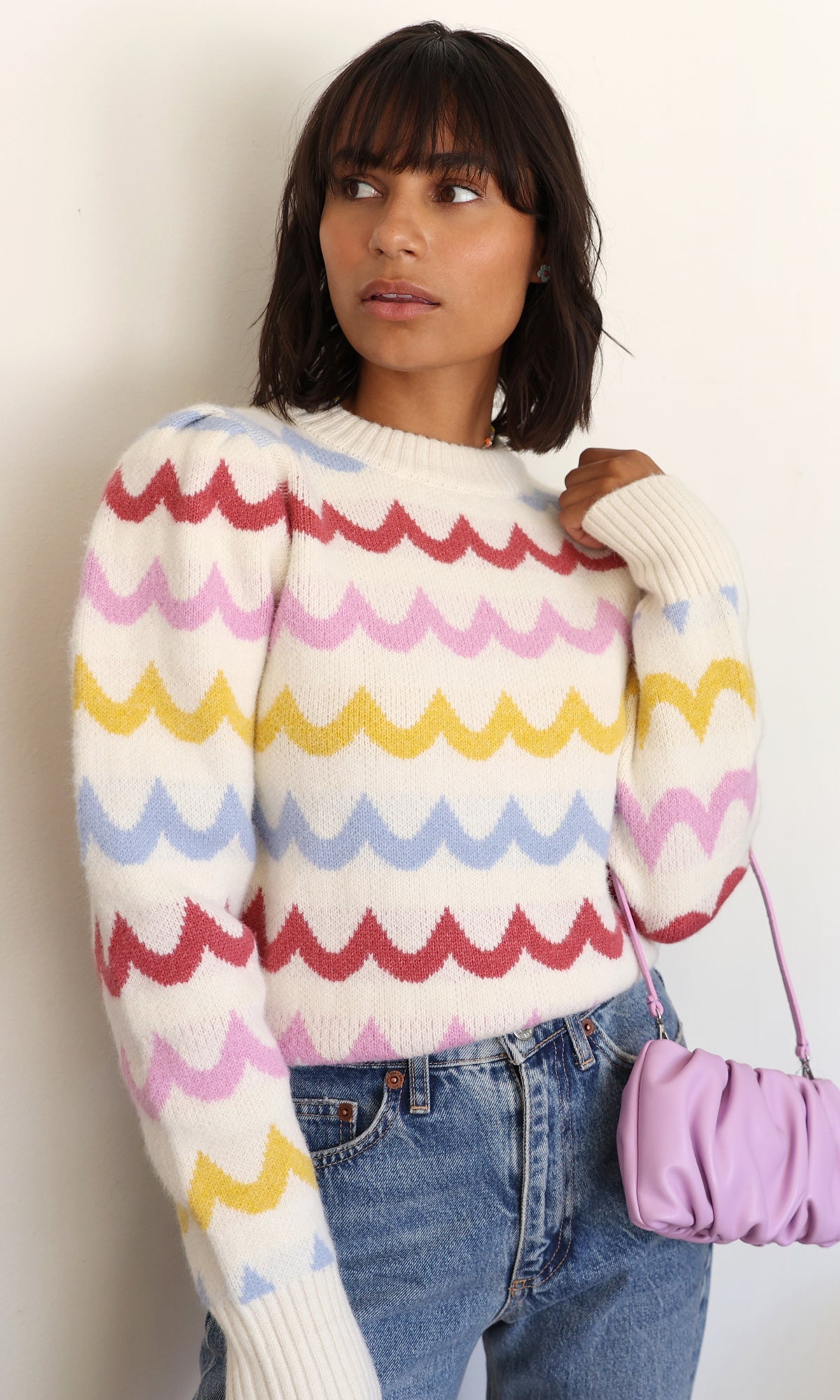 The Janey Wave Sweater Knit was made for sunsets by the beach. Featuring a fun multicolored wave print, puff shoulders, and a crew neckline, this sweater is a shore thing.