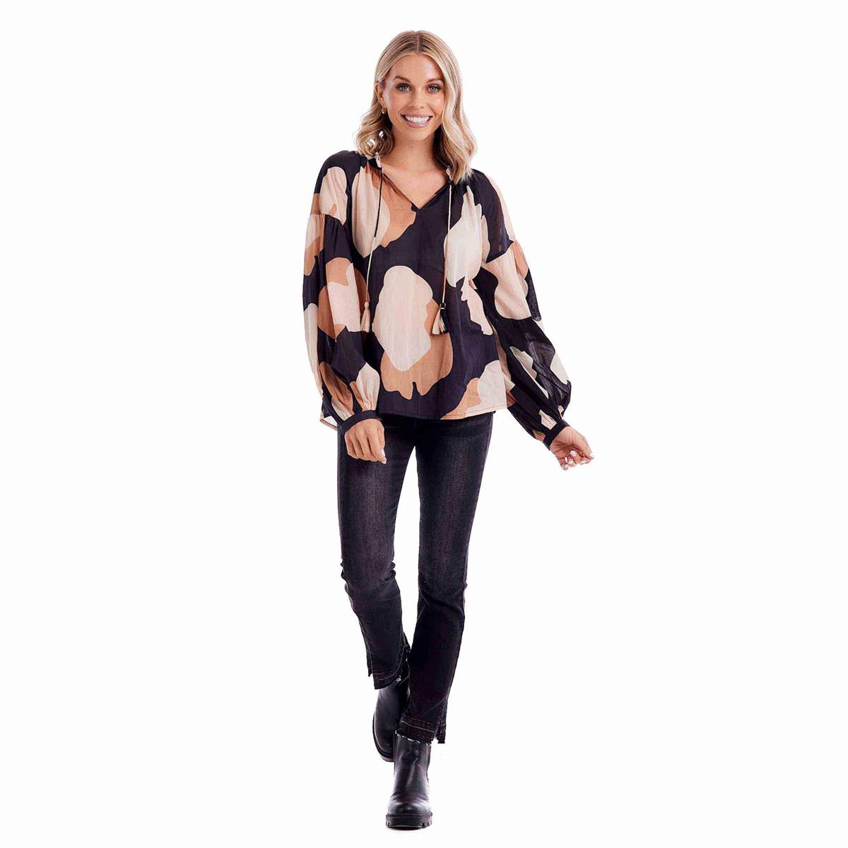 Cotton voile top features custom prints, balloon sleeves and V-neck with tassel ties. Measures approximately 25 1/2" from shoulder to hem on size small.