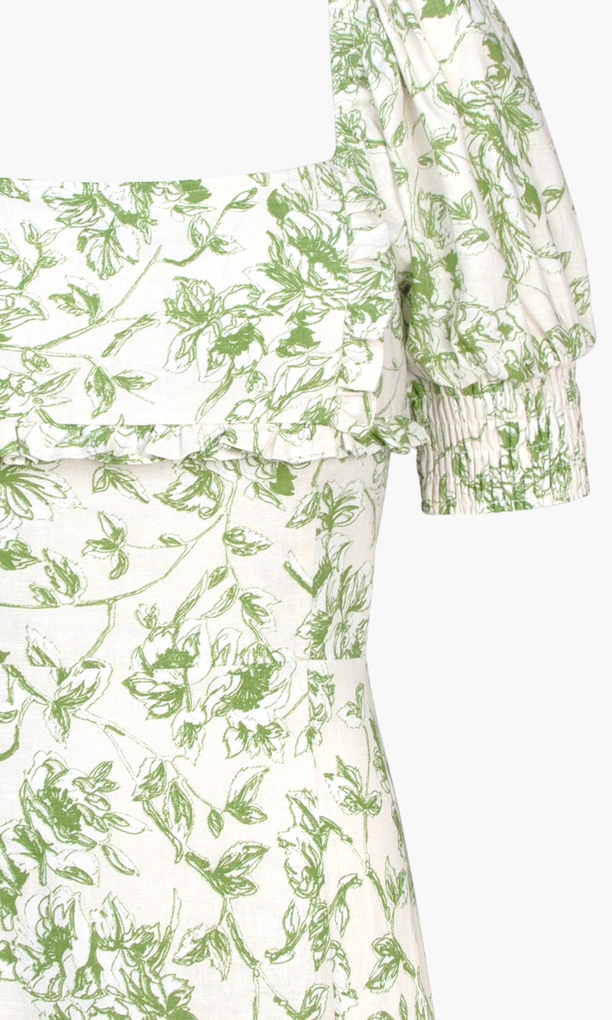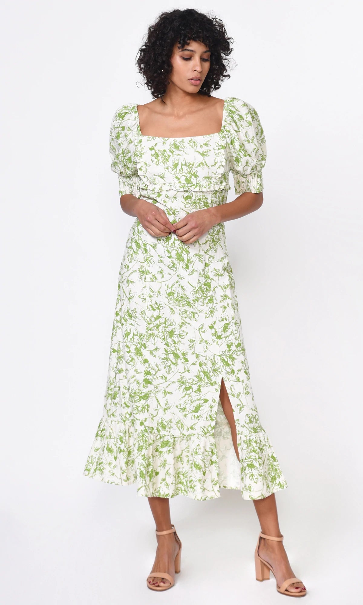 This eco-friendly midi dress features a square neckline, puff sleeves, smocked panel along back, side slit, and a ruffled hem.