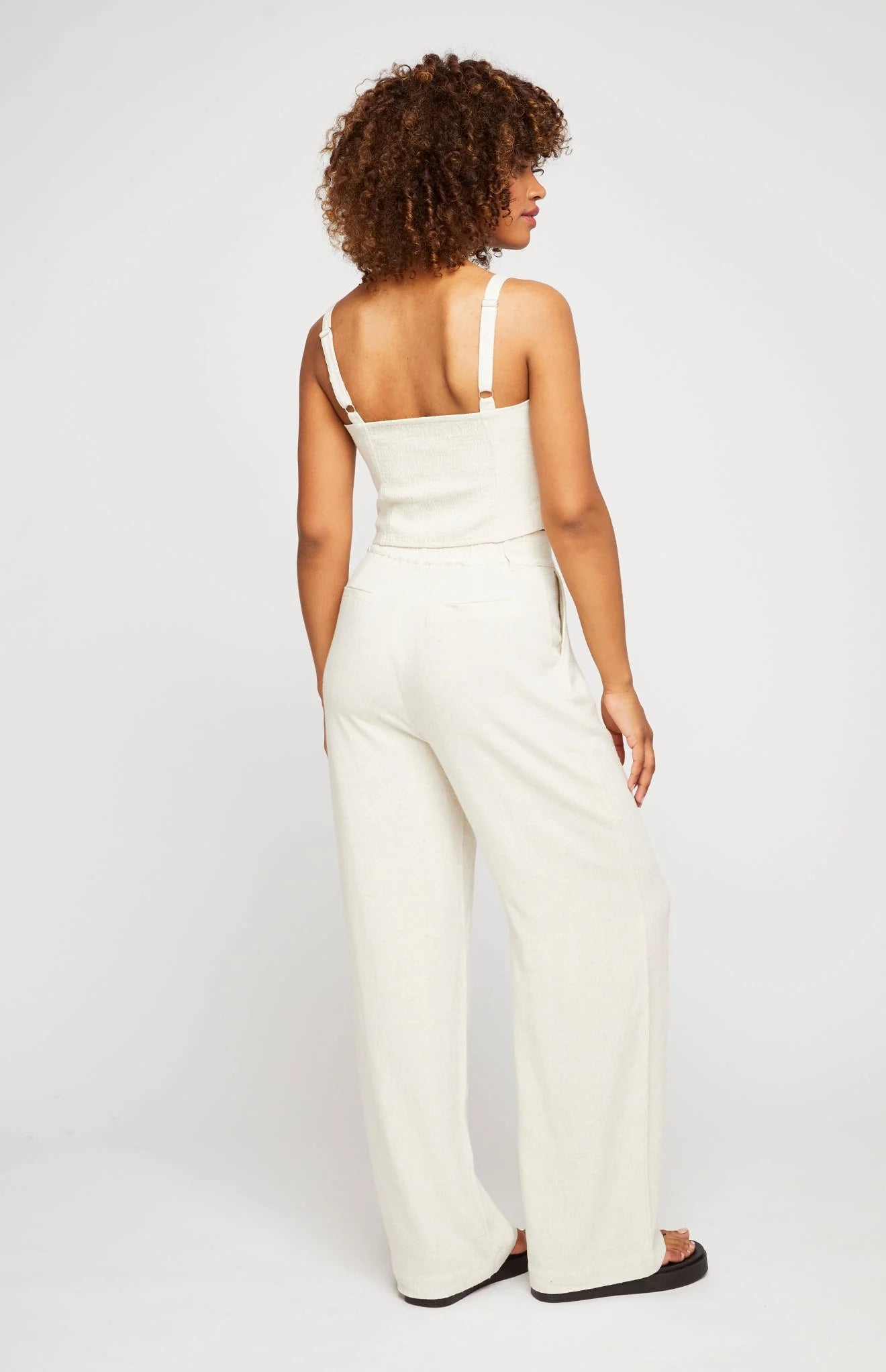 The Delphine is a classic trouser silhouette reimagined in a linen blend for an effortless look and feel. Features include slash pockets, a front fly zipper and back elastic for ease of wear.