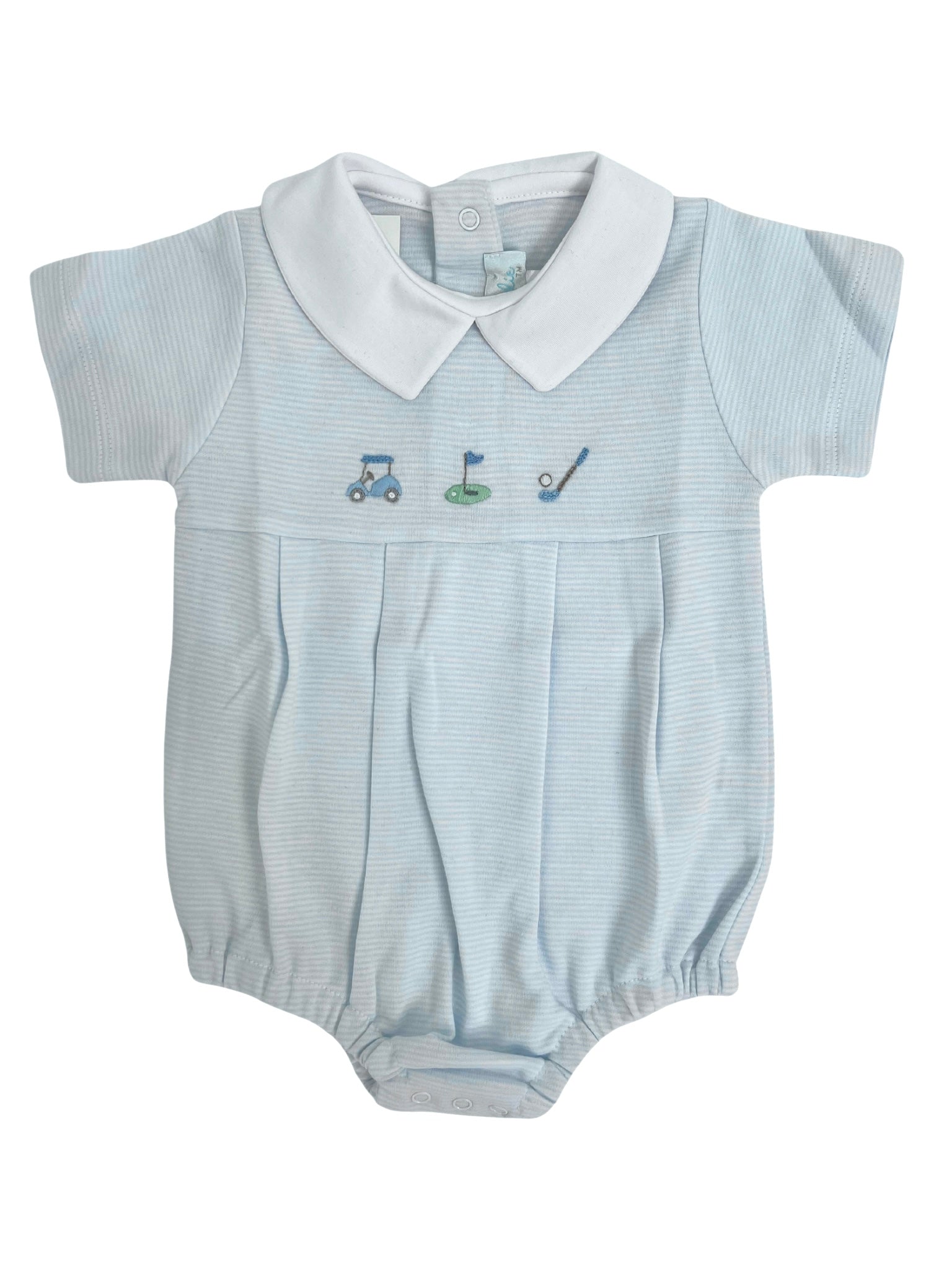 The golf themed embroidered details really pop against the ministripe fabric. Each hand-embroidered motif is meticulous in design. The round collar adds an elegant touch to this classic style.