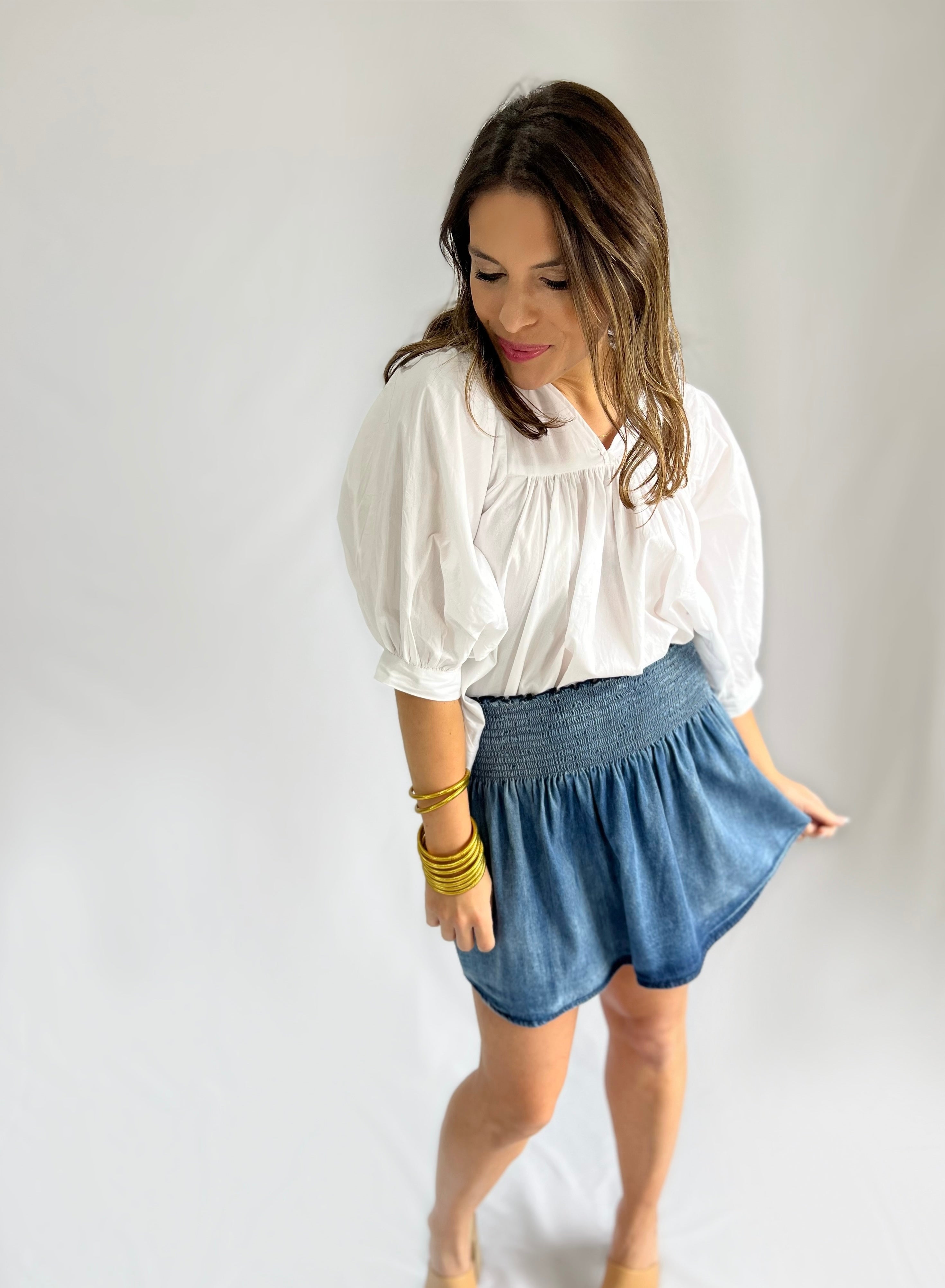 Lt Wash Denim Elastic Shirring Mini Skirt