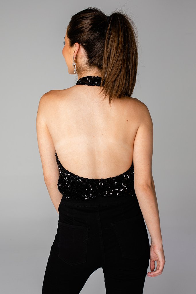 Black Lulu Sequin Halter Bodysuit