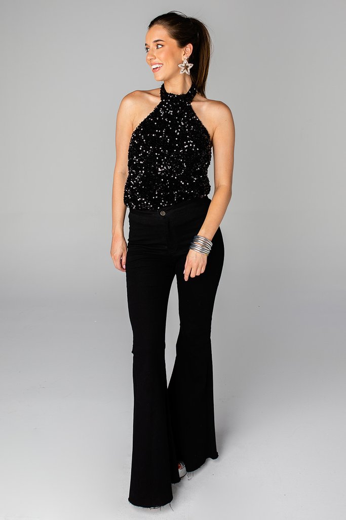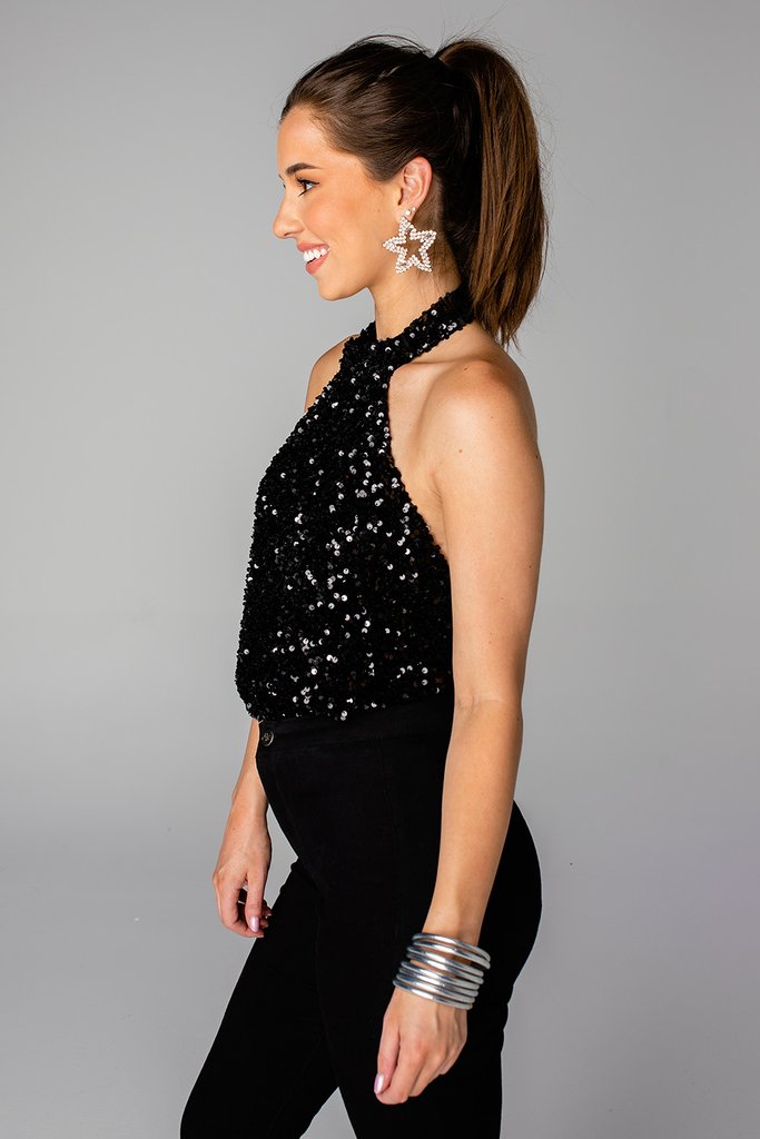 Sequin is your signature color! The Lulu features a halter neckline, low back, snap closure on the bottom, and beautiful black sequin material. This cut is so flattering, you'll have everyone asking where you got this top from! Pair with black jeans and heels for a classy look!