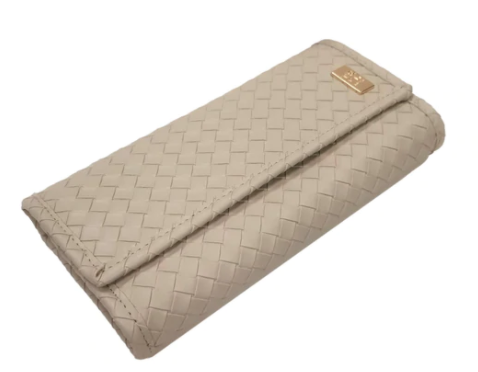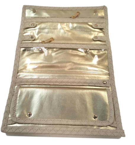 Our Jewelry case is a sleek clutch that holds so much! Crafted in Vegan Nappa woven leather, this high function case offers 2 inside zip pockets, snap tabs for chains, a pendant pouch, ring roll and earring bar with protective flap. Each bag is lined with our signature liquid gold.