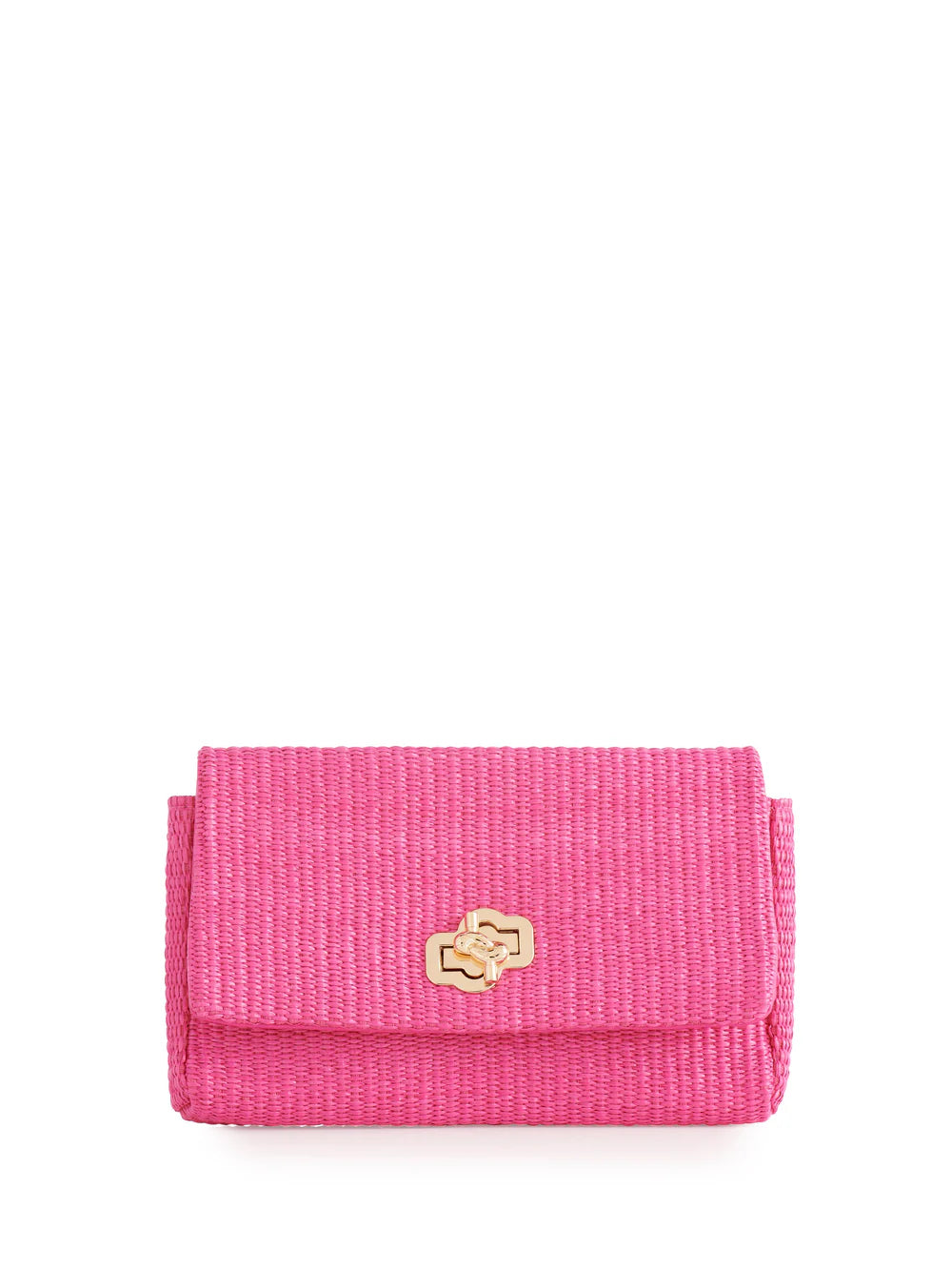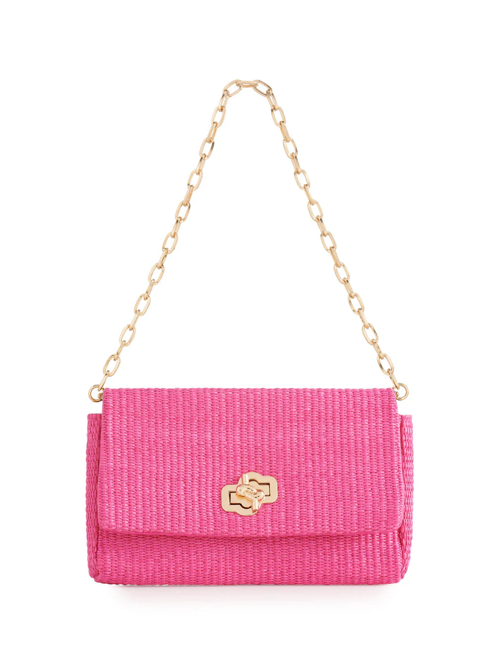 The Raffaella Shoulder Bag is your chic new plus-one for every occasion. Crafted from natural woven straw with a luxuriously sleek finish, this structured bag features a stylish flap closure secured with a gold turn-lock clasp for that touch of elegance. The standout chunky gold chain doubles as a statement shoulder strap, while its roomy interior keeps all your essentials organized and within reach. Available in vibrant hues like orange, magenta, lime, and classic neutrals, it’s the ultimate blend of playful and polished.