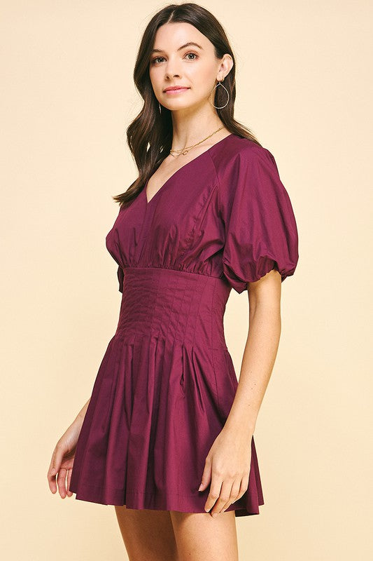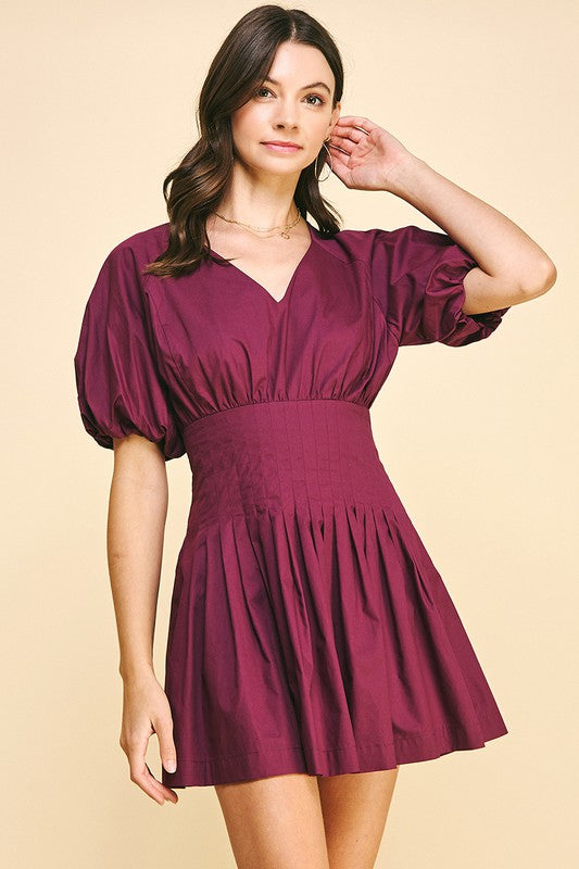 V-NECK, PUFF SLEEVES, PLEATED AT WAIST AND SKIRT BACK, INVISIBLE ZIPPER CLOSURE