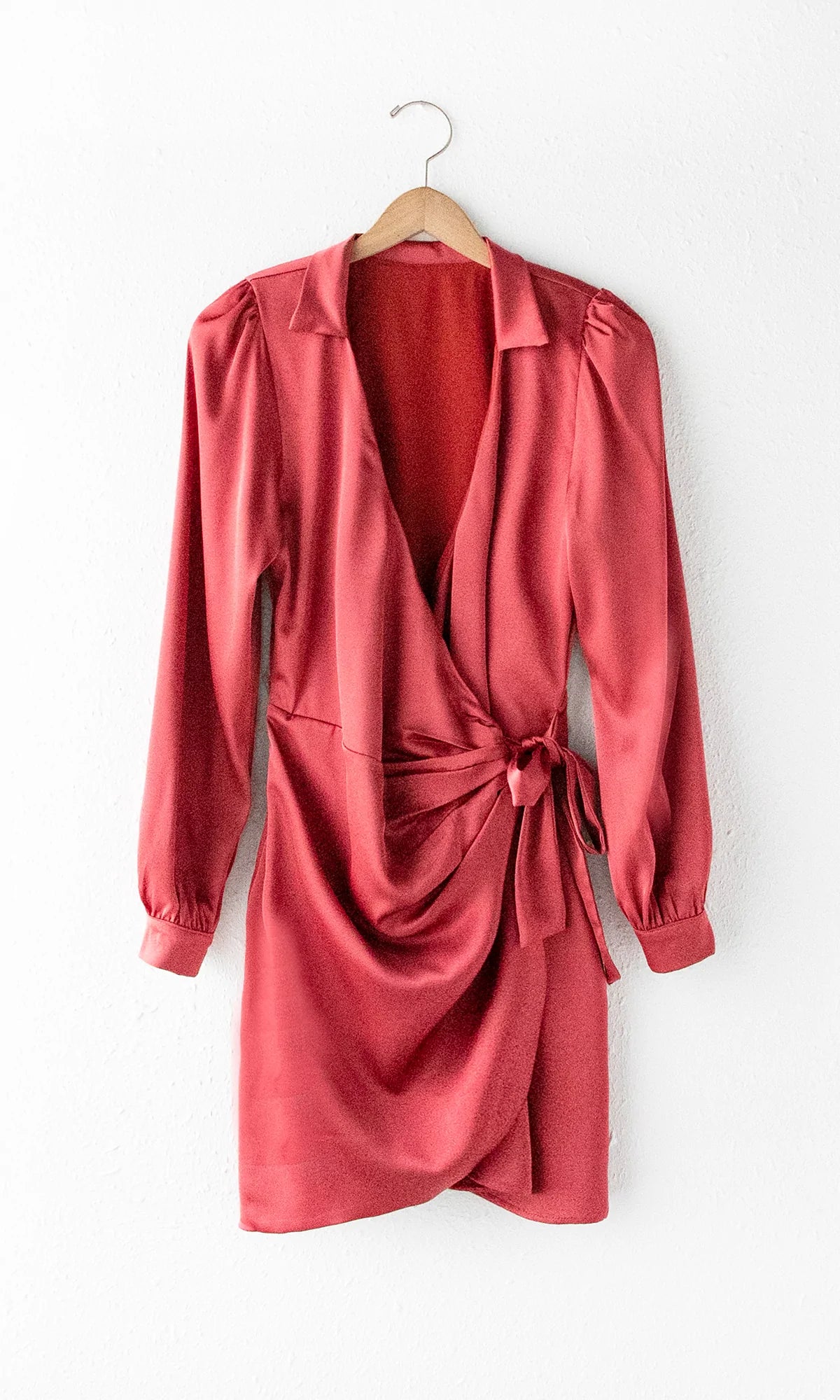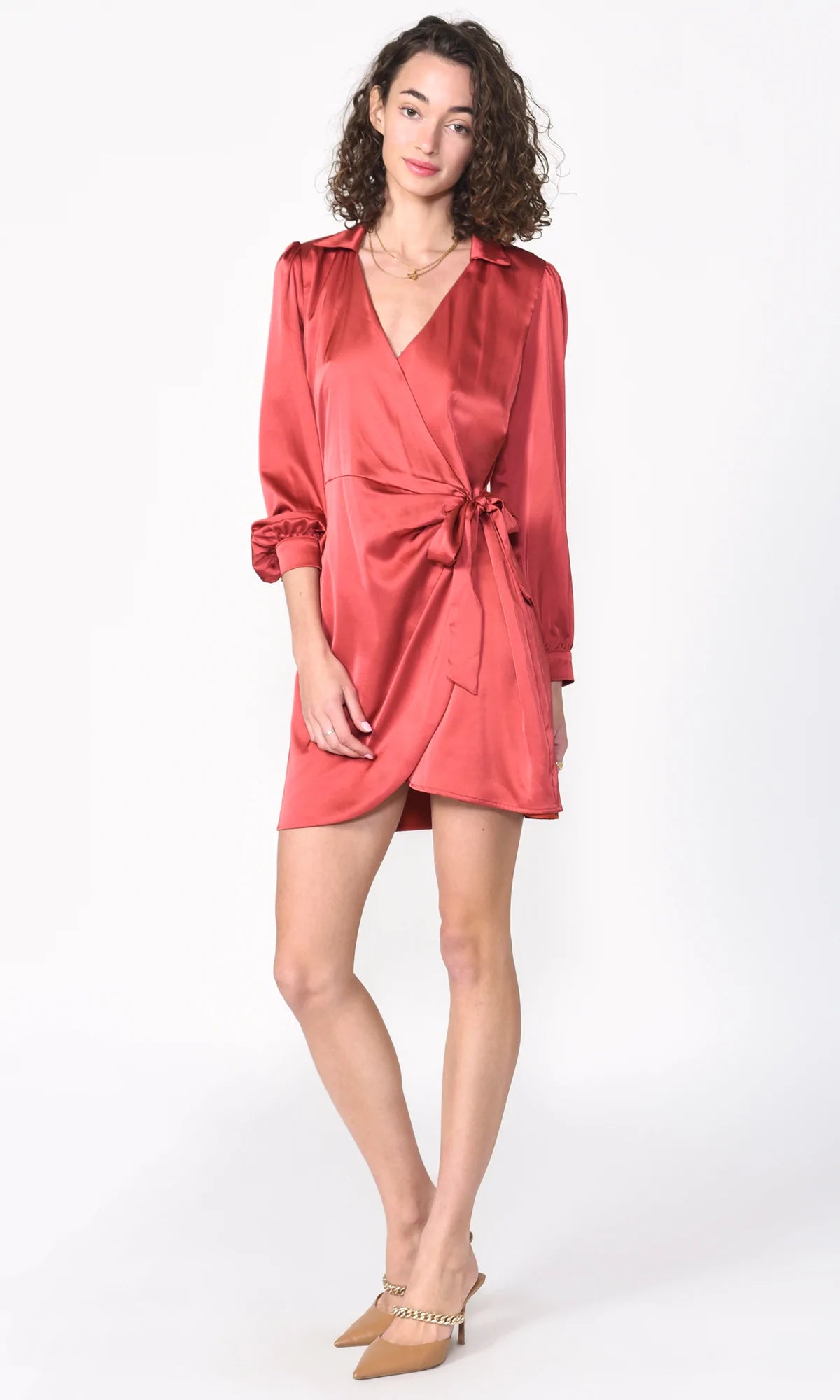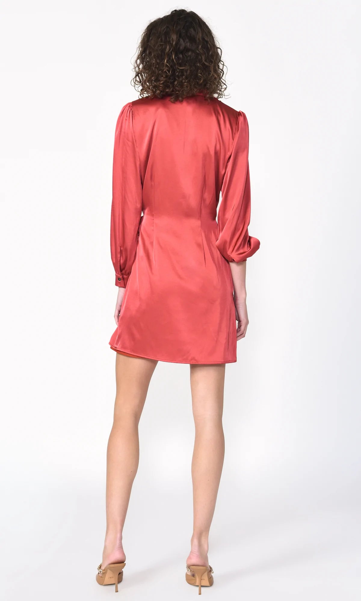 Cut from a satin fabrication the Donny Dress features a front drape with tie detail, long sleeves with cuffs, and a clean collar. Invisible side zipper closure.