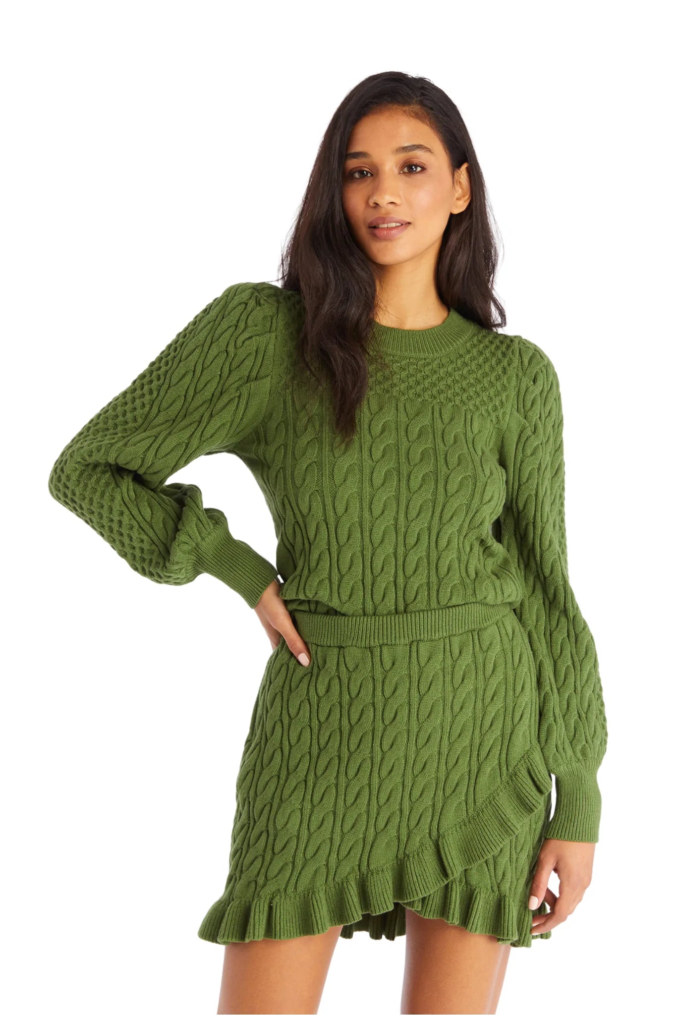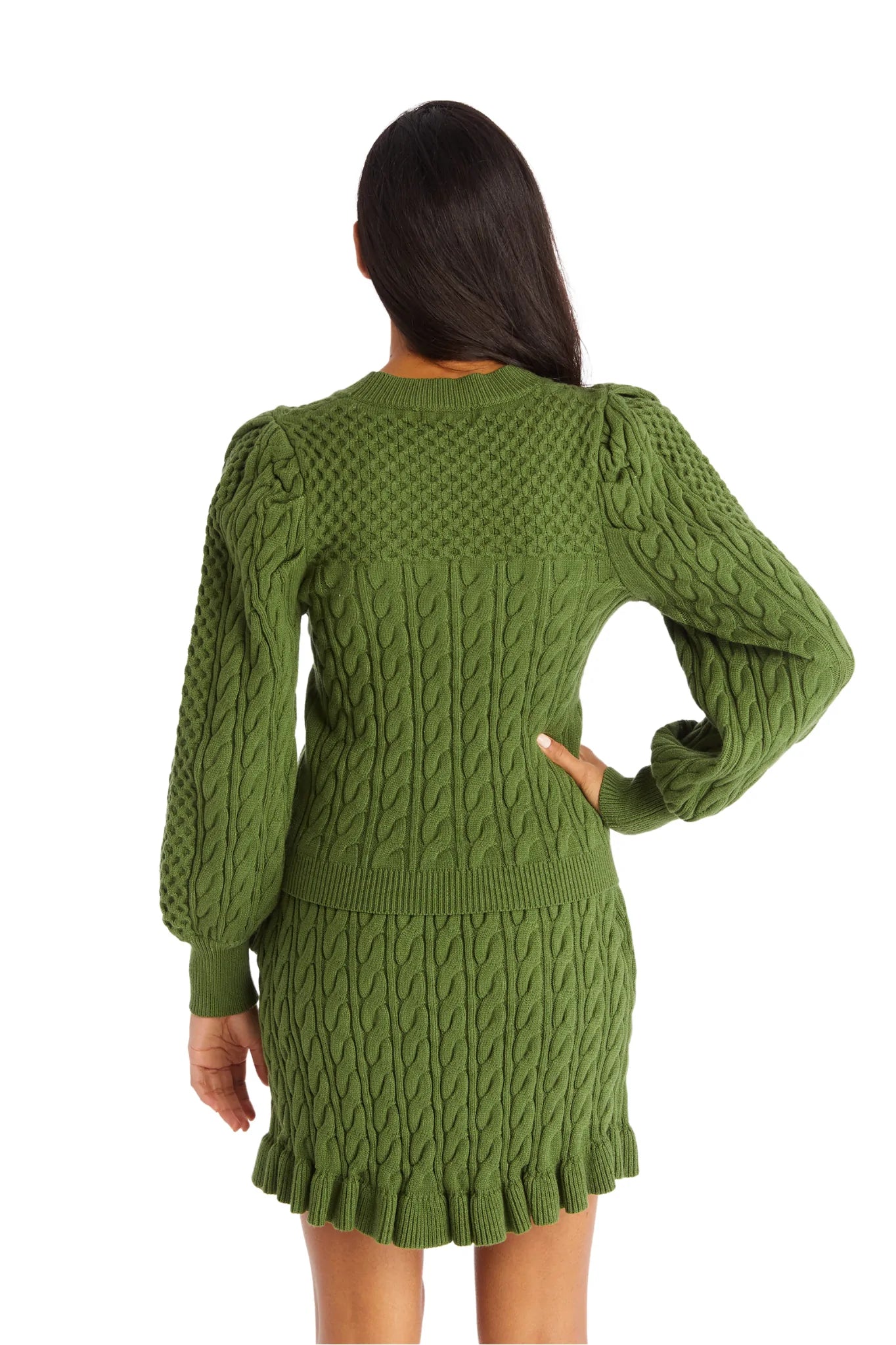 The classic Iris Sweater is back in the jewel toned Martini Olive color. Designed in a soft viscose yarn and intricate cable knit pattern; The slightly slim fit throughout the body makes this piece an instant classic. Show your romantic side with the exaggerated shoulders leading to a billowing sleeve and ribbed cuff. Pairs perfectly with the matching Sloan Mini Skirt.Ā