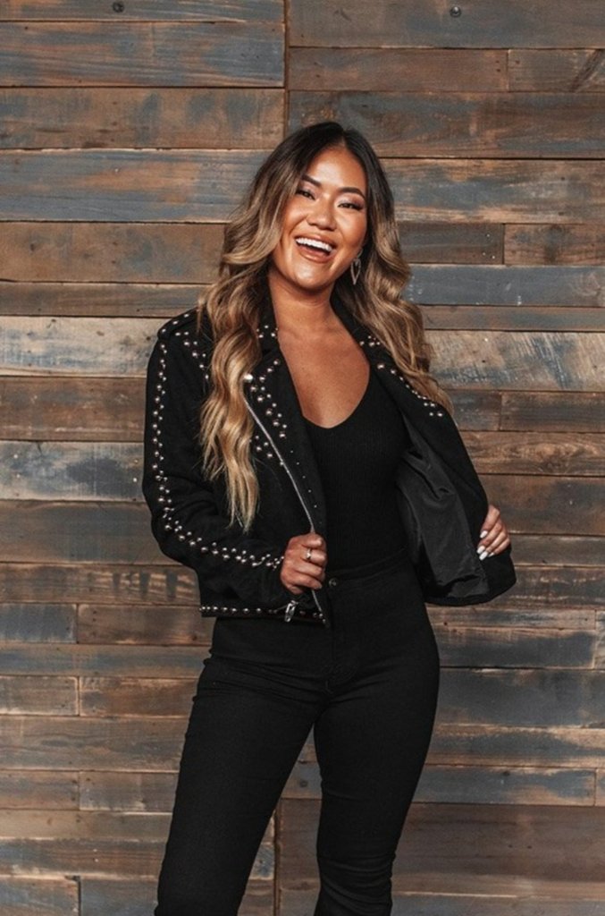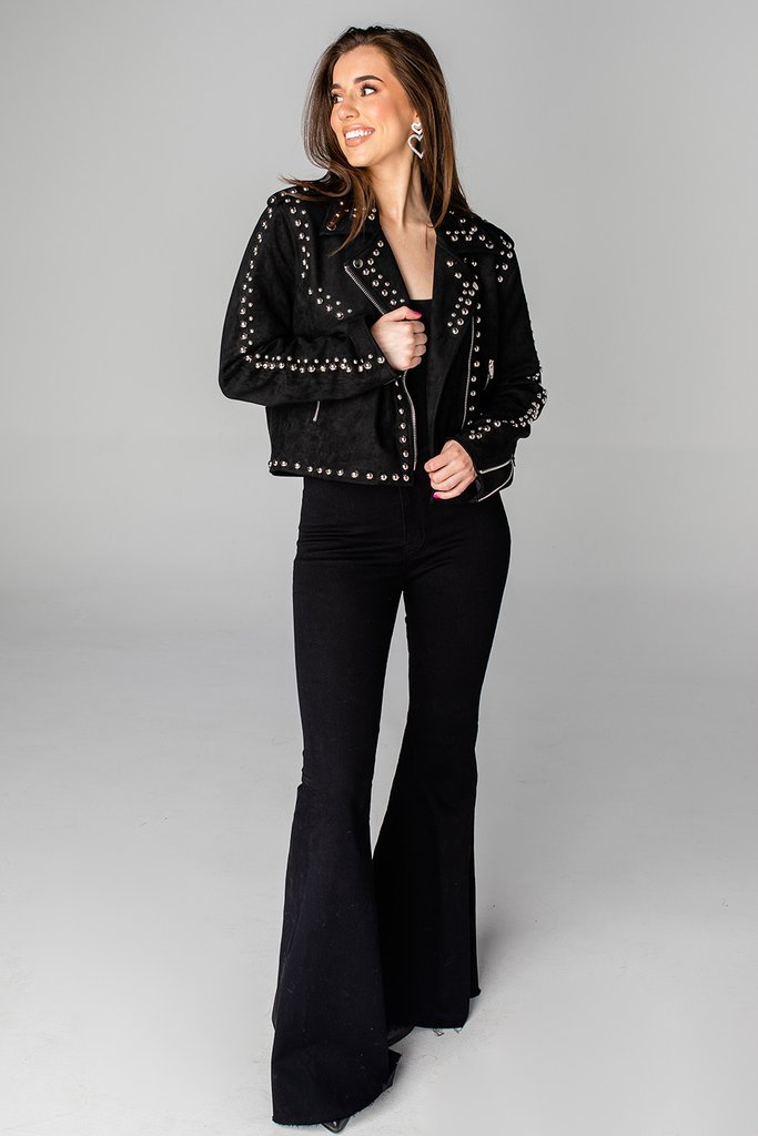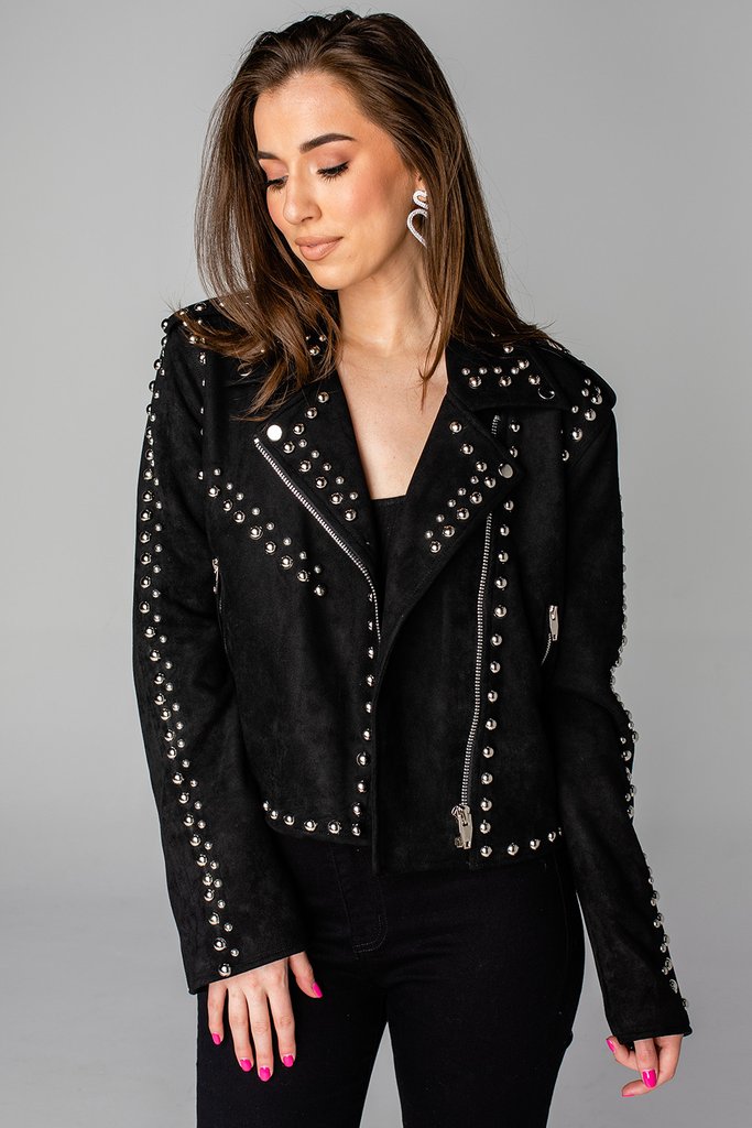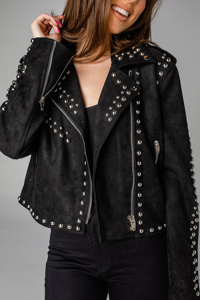 Suede never looked so cool! Similar to our Bianca Studded Jacket, the Mick features beautiful metal studded detail, zip embellished pockets, a studded lapel, and adds just the right amount of pizzaz to any outfit. Add your favorite dress to make it more edgy, or a simple bodysuit and jeans for a causal vibe.