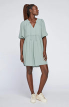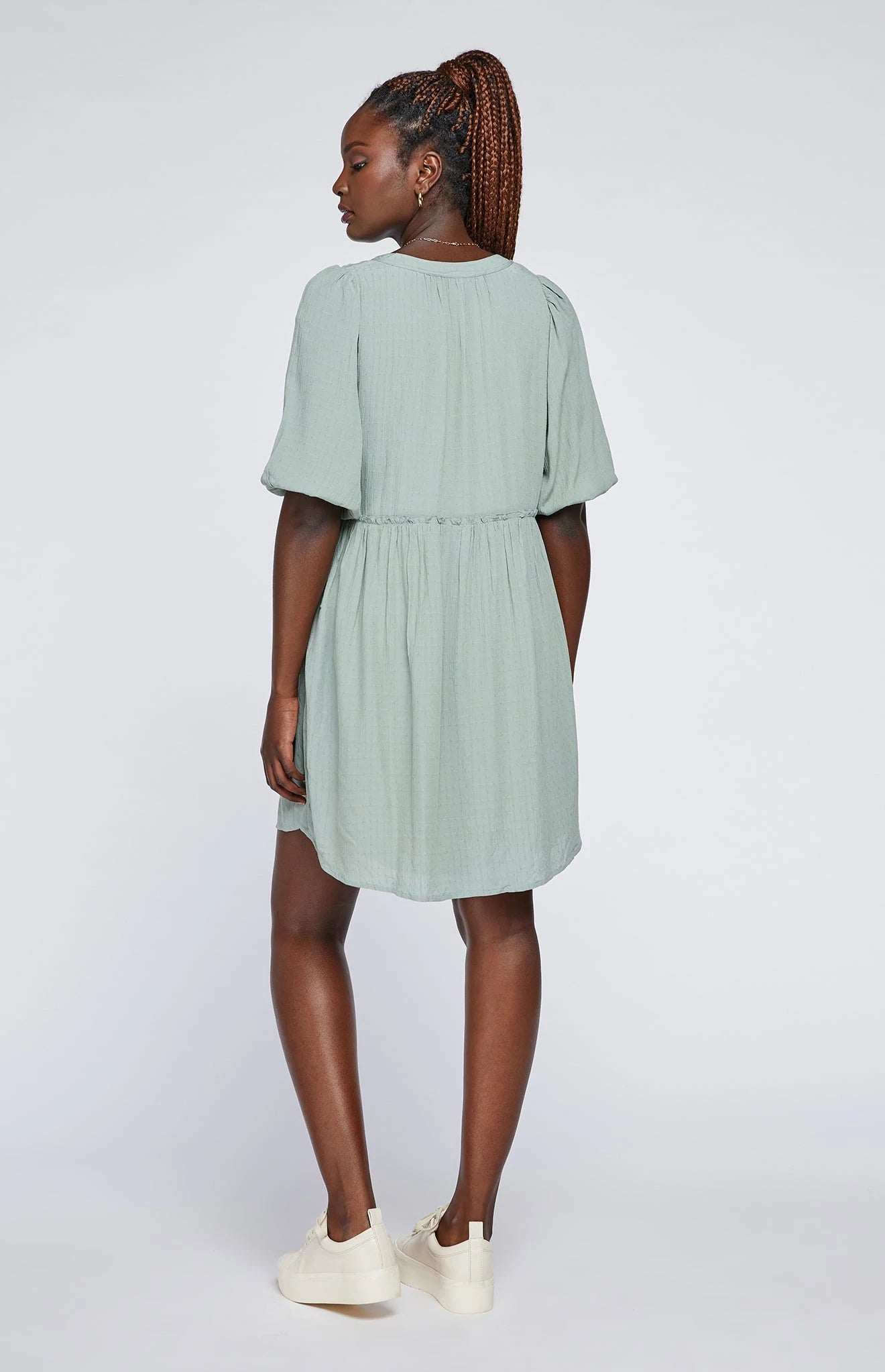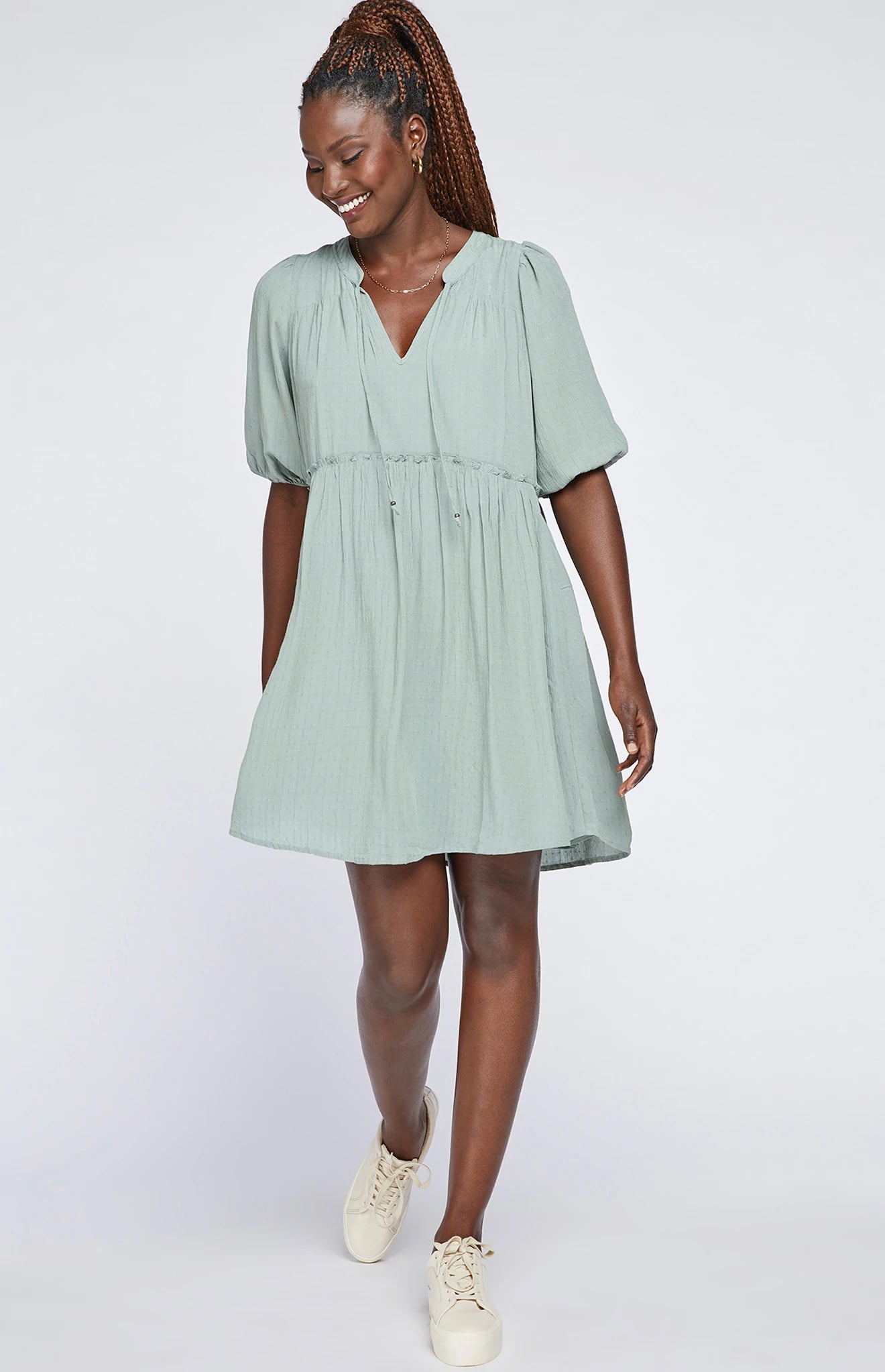 The Joplin dress is made of a soft textured dot fabric and lined for ease of wear. Features include a gathered waist detail, neck ties with metal beads, and a short sleeve with encased elastic at the hem.