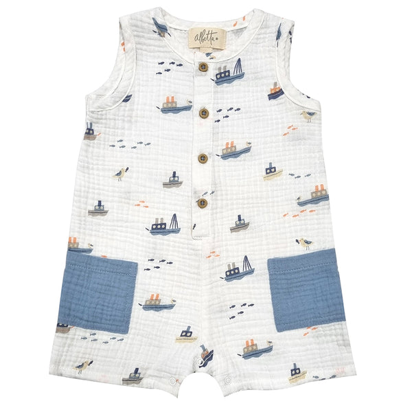 Beautiful lightweight gauze nautical print romper. Featuring fishing boats amongst shoals of blue and orange fish with cheeky seagulls stealing the catch on a white background. Sleeveless and footless with blue pockets for boho baby style. Buttons to the front and poppers between the legs make for easy dressing of baby and because it’s made from the softest cotton you’ll only have happy days. For toddlers the comfy fit is perfect for toddling around!