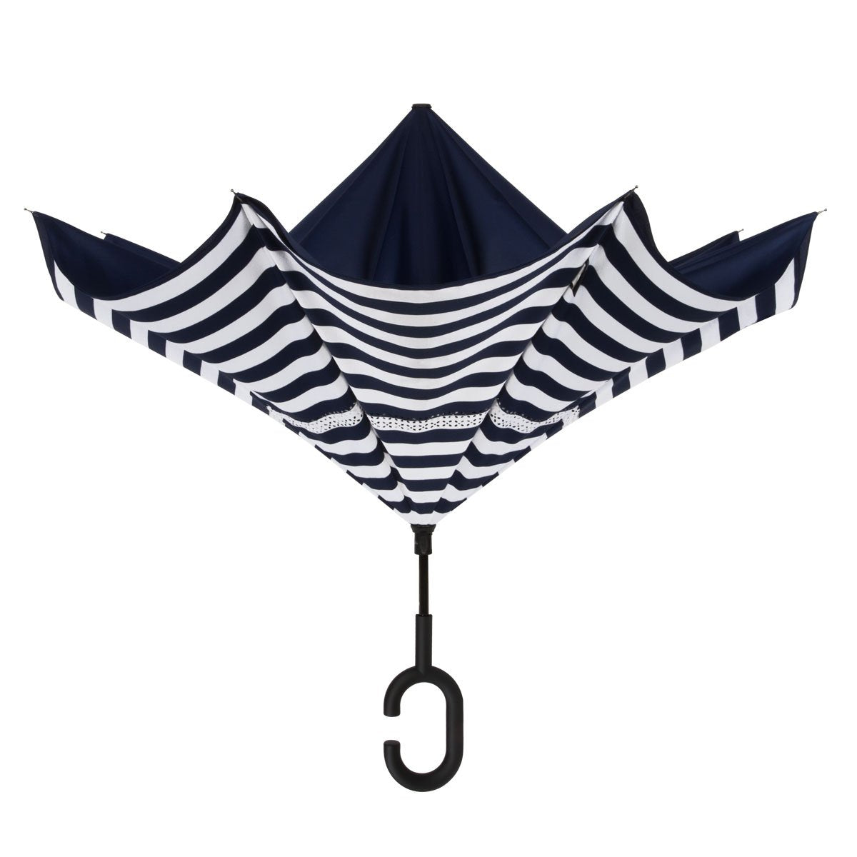 Utilizing a unique reverse open and close system, the water stays away from you by funneling into the umbrella when it's closed. With a rubber-coated C-shaped handle for hands-free use and steel and fiberglass construction