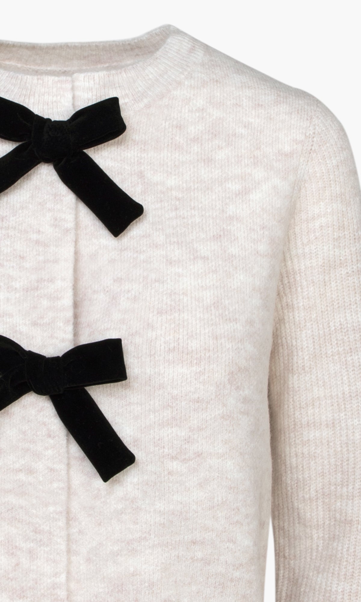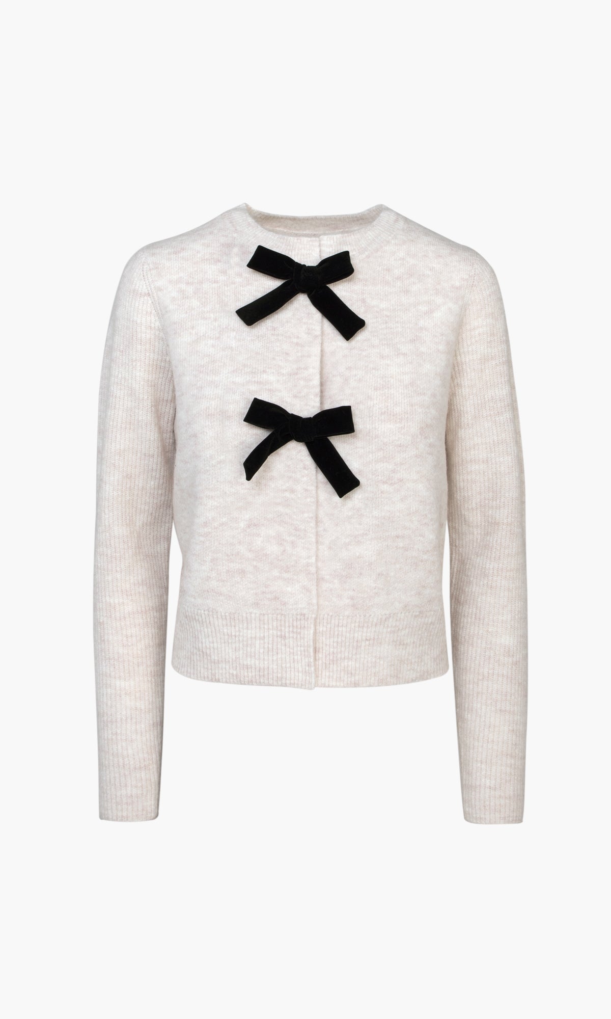 This soft cardigan features two contrasting front bows. Hidden snap closure along front and ribbed cuffs and collar. Pair with high-waisted denim and loafers for a flirty, school-girl look.