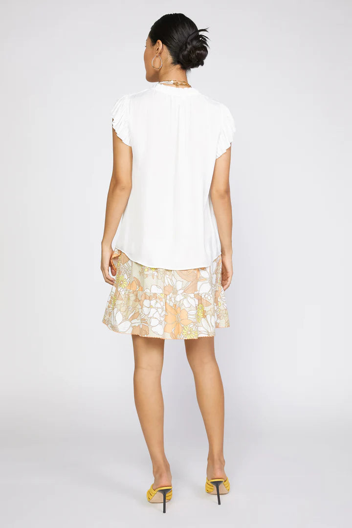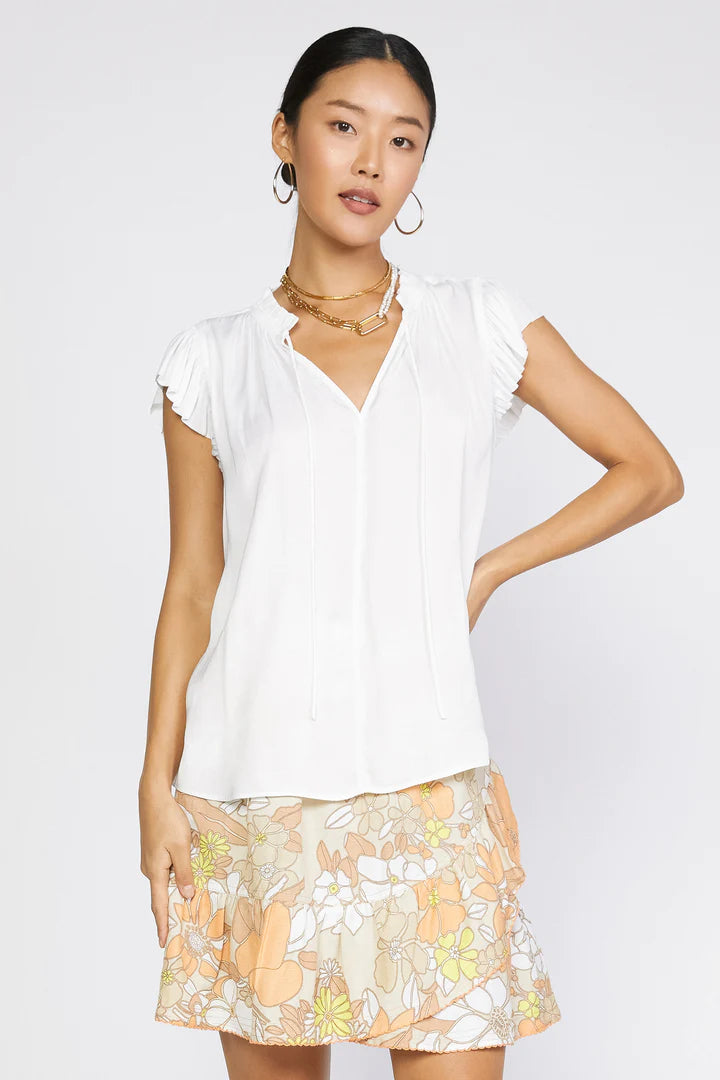 This pleated sleeve top is cut for a loose, easy fit and features a flattering split neckline with ruffle trim and tie detailing. A new favorite for your everyday wardrobe