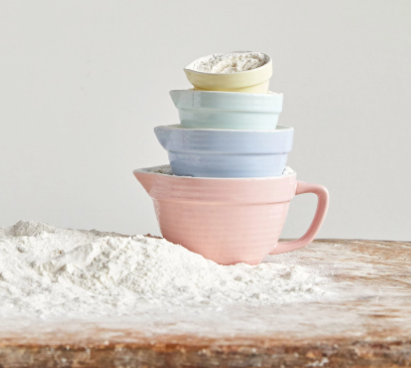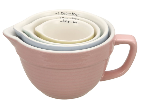 These charming measuring cups are inspired by vintage batter bowls. Perfect for your cooking needs, the inside of each of these measuring cups is marked in both ounces and cups. One side of each is designed with a V-shaped spout for easy pouring. They stack inside each other for easy storing and are dishwasher safe.