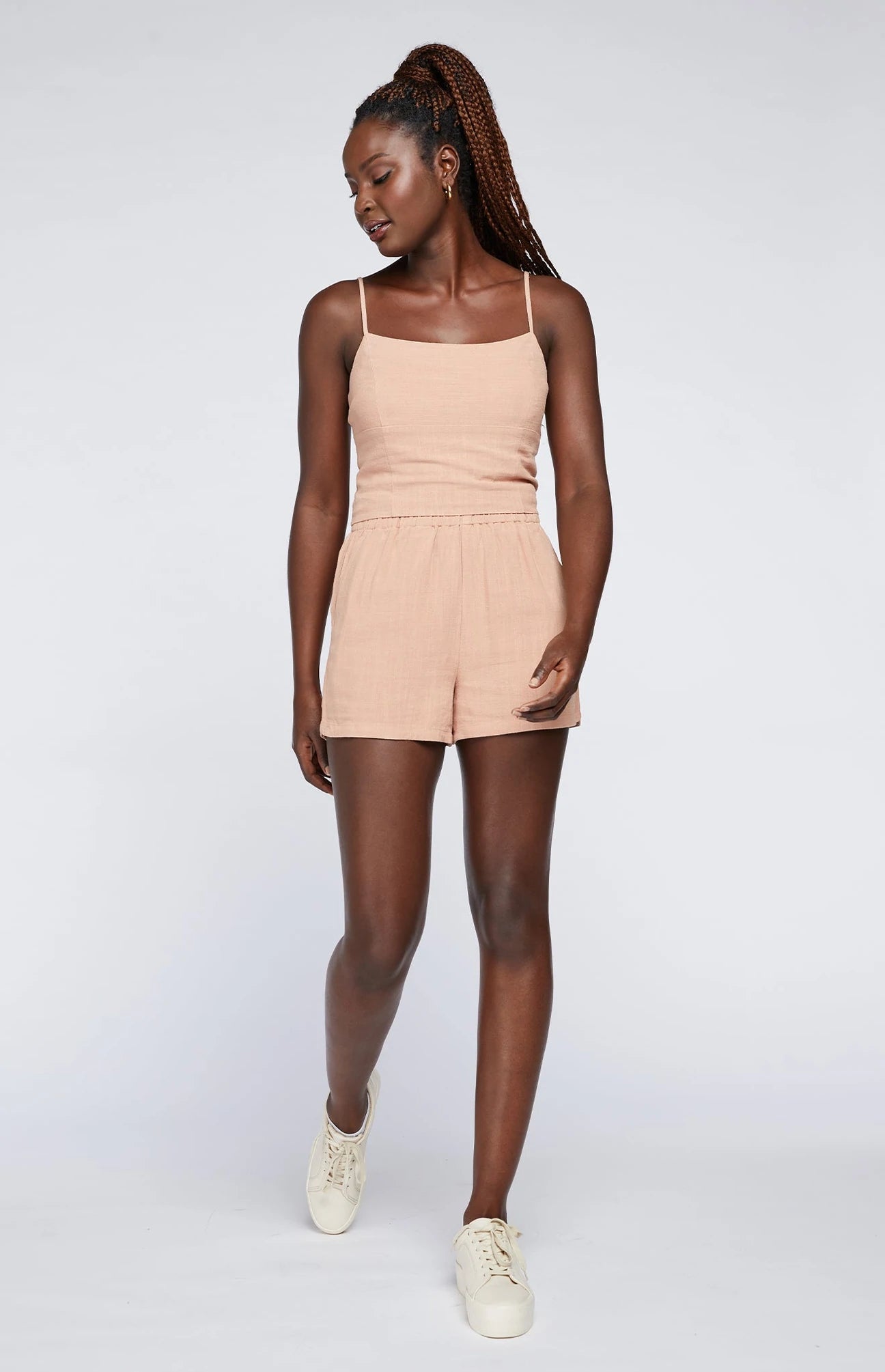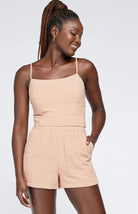 The Roxanne tank is made of a linen blend and is fully lined for ease of wear. Features include adjustable straps and smocking at the back body. Pair with the Shore short for a coordinated look.