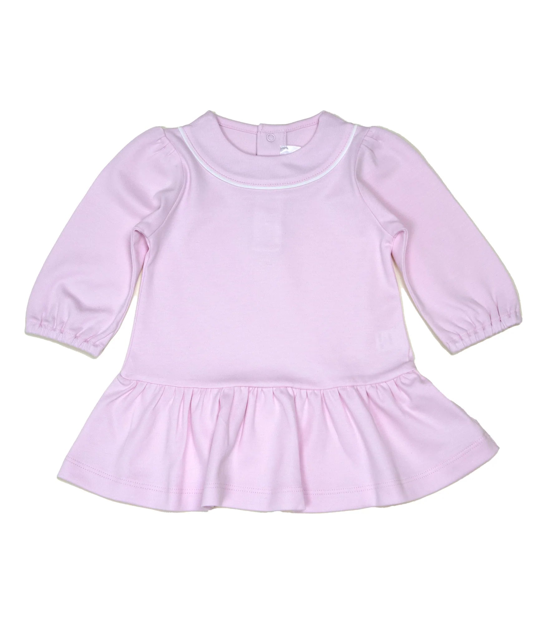 Buttery soft long sleeve dress in pink jersey fabric with an elegant white trim detail at the neck. Understated elegance in perfect comfort.