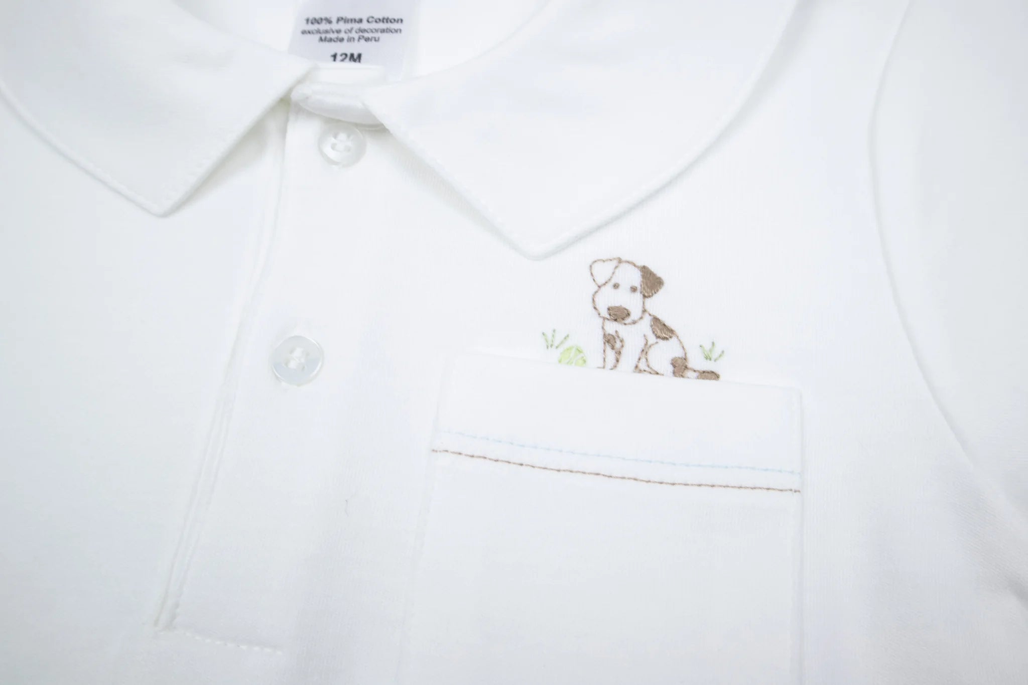 Our Puppy Short Play Set, made with heirloom pima cotton, features hand embroidered detail for a comfortable and stylish look. Ideal for infants, the set includes easy to pull up shorts and a shirt in white and light blue. Perfect for their first wardrobe.
