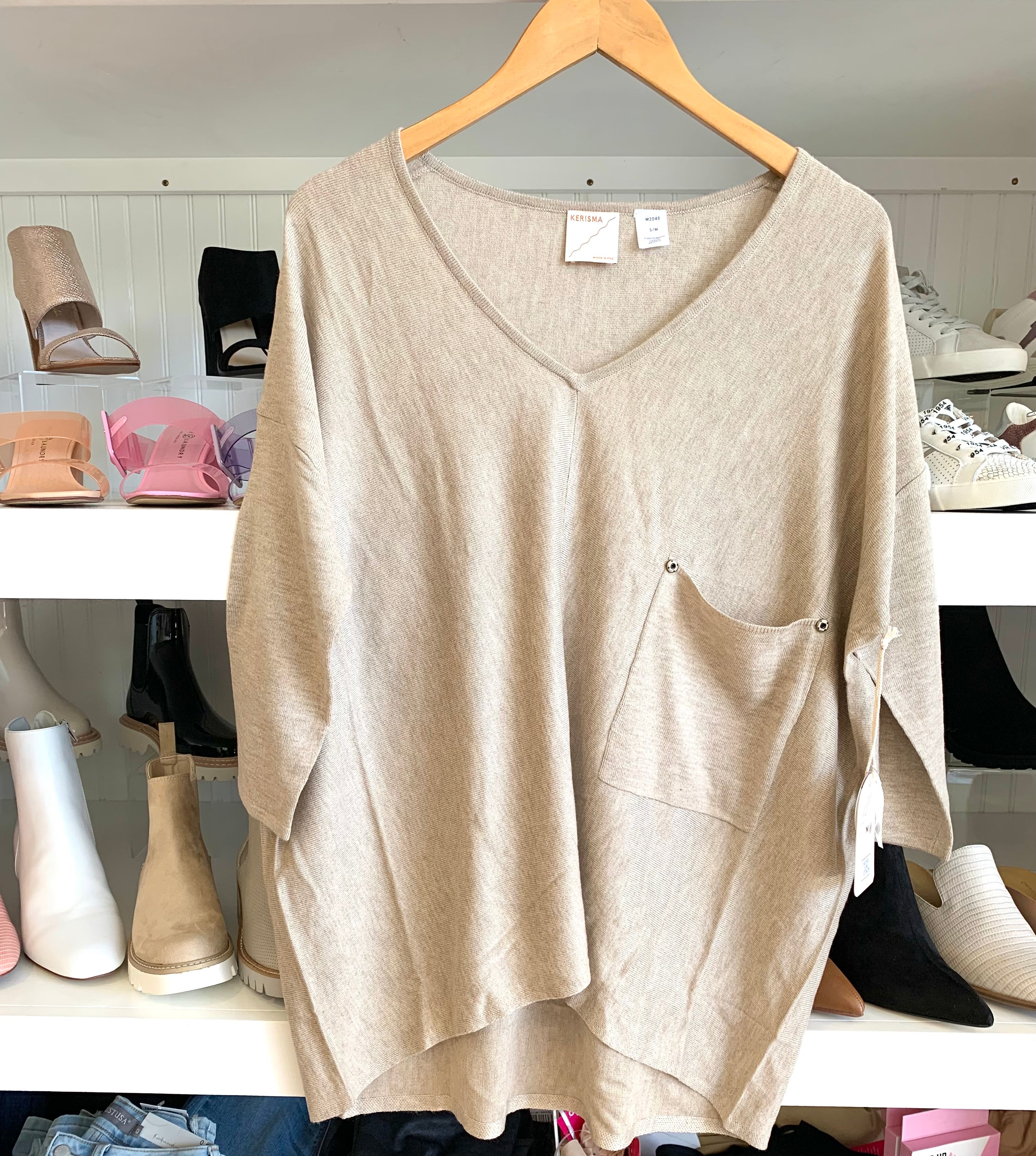 Center-seamed 3/4 sleeve v-neck top with chest pocket and brass accent buttons.