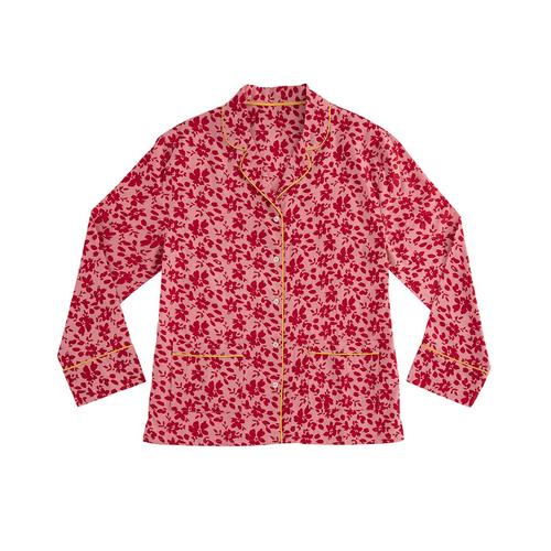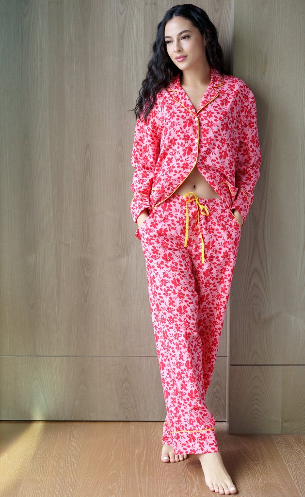 Nothing is better than slipping into the Noelle PJ set before a blissful night’s sleep. This set features a bright red floral print upon a pink background with yellow detailing along with lapel, waistline, pockets, and hem giving this set an extra pop of color. The color and print combination makes this sassy set perfect for the holidays or every night sleep.