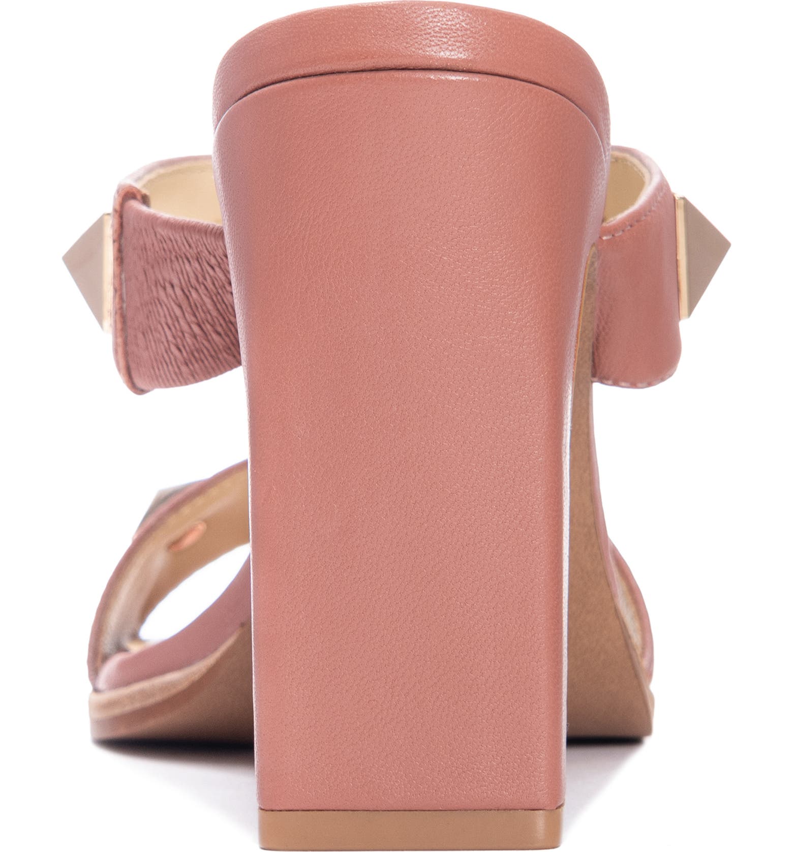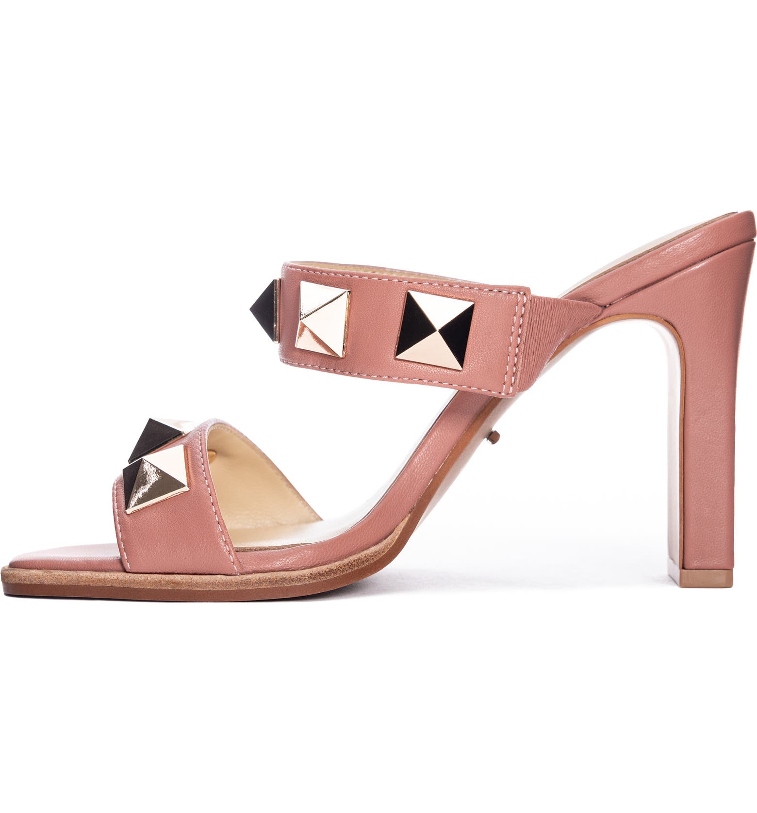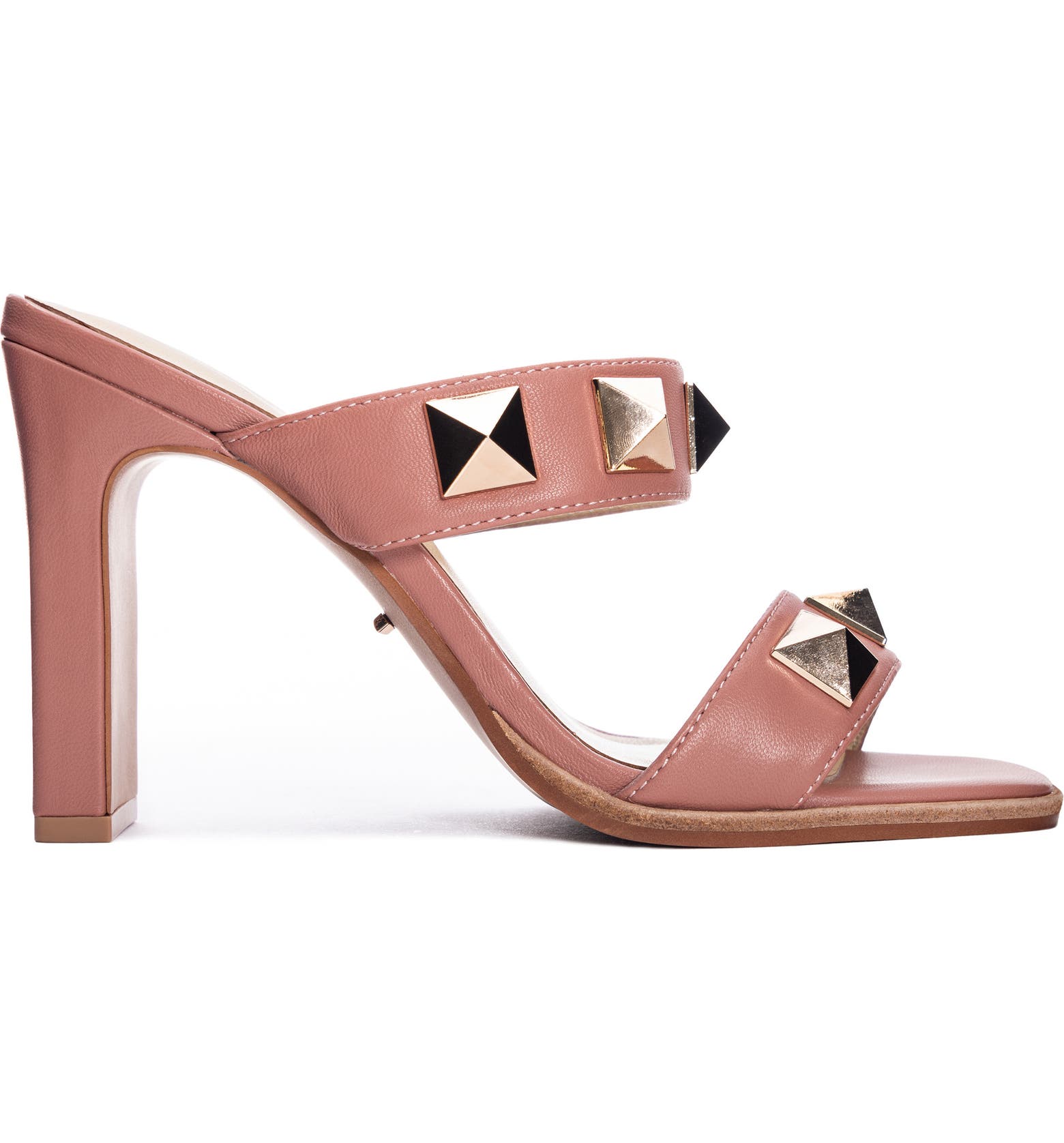 Gleaming square studs heighten the style of this double-strap sandal that rests atop a slender block heel.